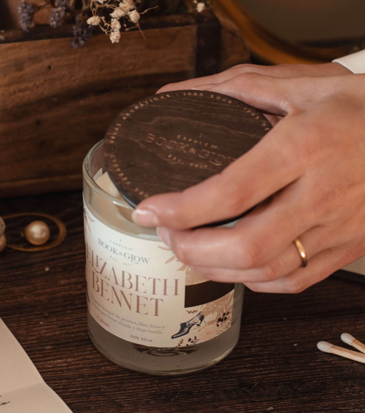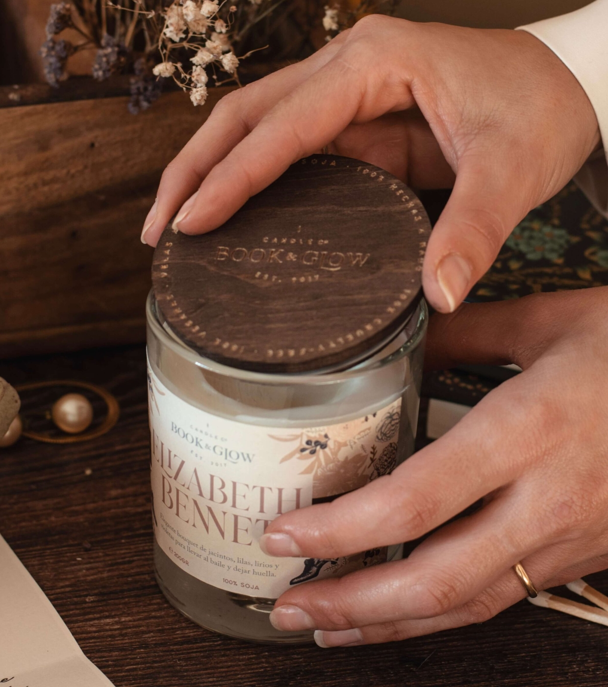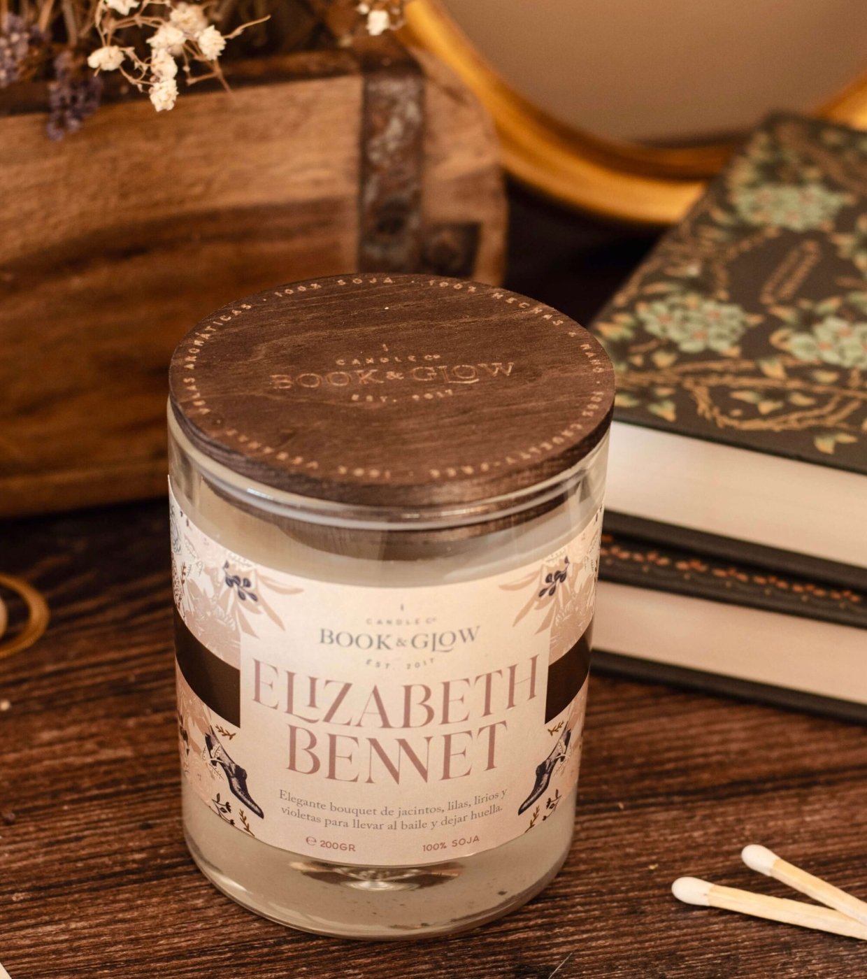 Vela de soja de la colección Mundos Extraordinarios de Book and Glow. Elizabeth Bennet.