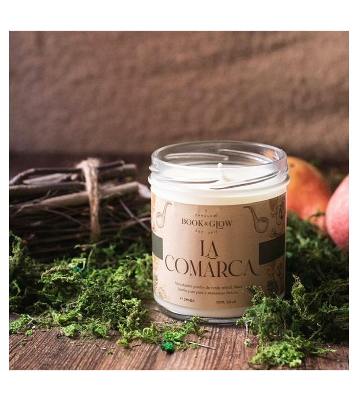 Vela de soja de la colección Mundos Extraordinarios de Book and Glow. La Comarca.