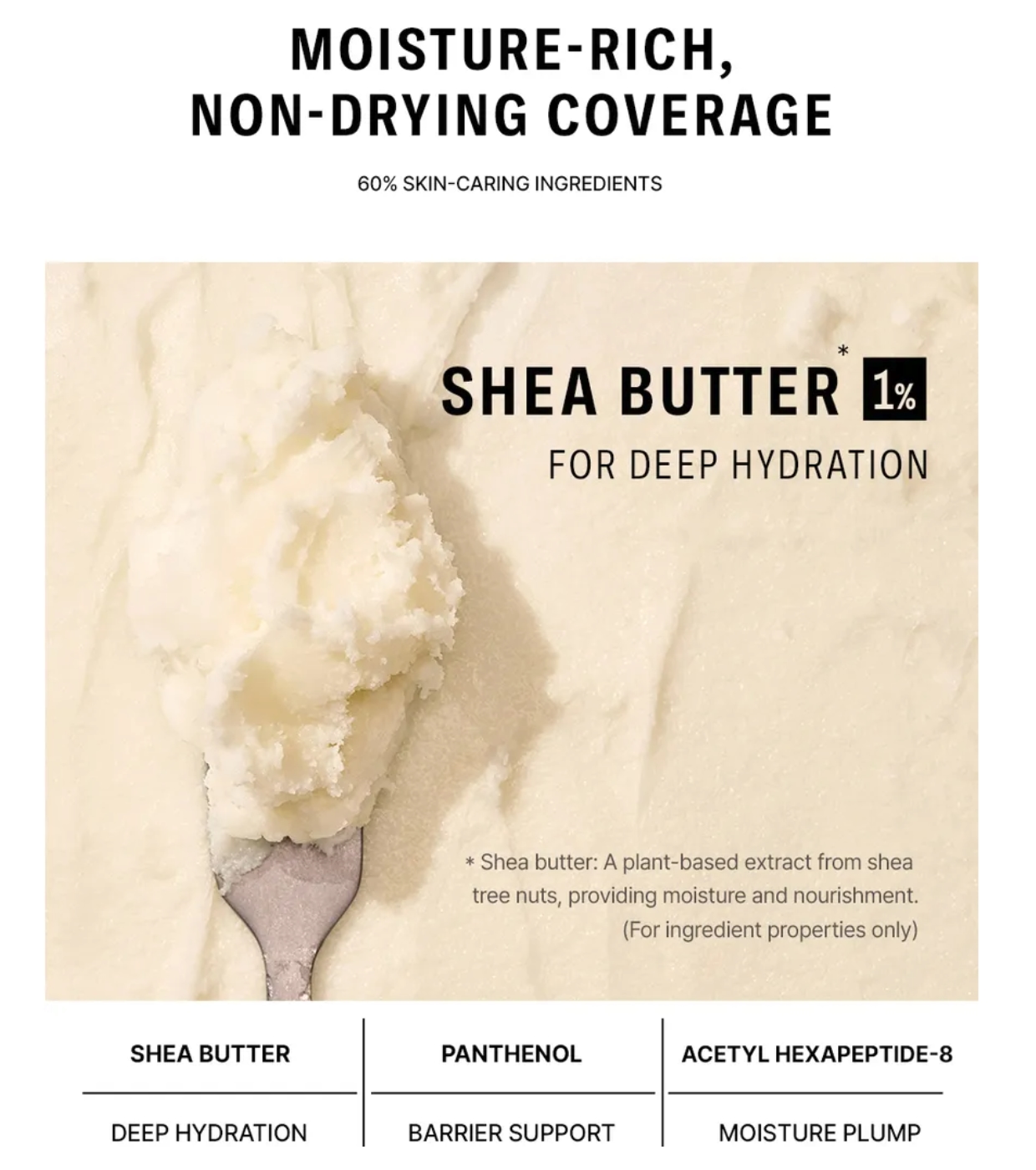 Gracias a su fórmula con un 60% de ingredientes hidratantes y un 1% de manteca de karité, mantiene la piel suave, flexible y sin sensación de sequedad, incluso en acabados mate.