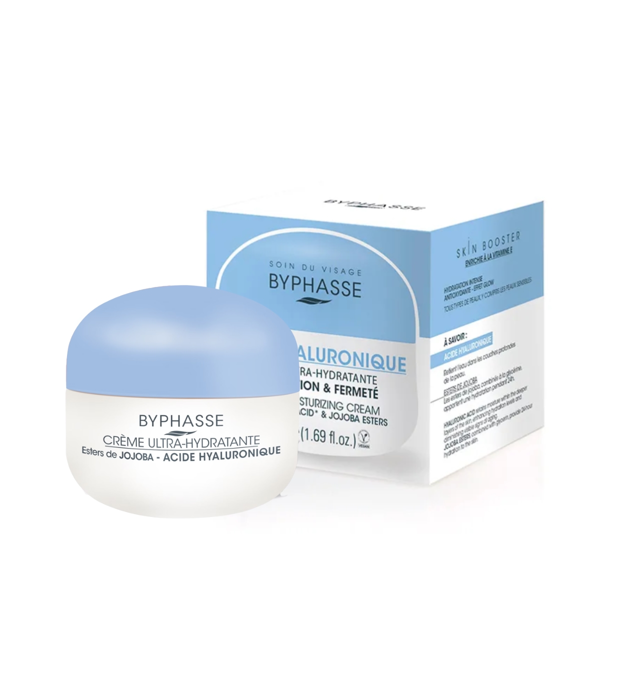 La crema hidratante con Ácido Hialurónico de Byphasse está formulada con ácido hialurónico derivado y una combinación de ésteres de jojoba y glicerina, proporcionando una hidratación intensa y duradera durante 24 horas.