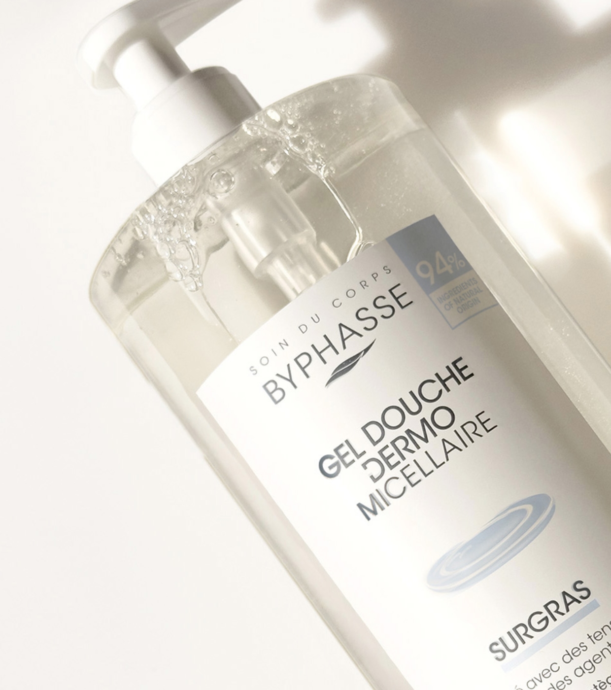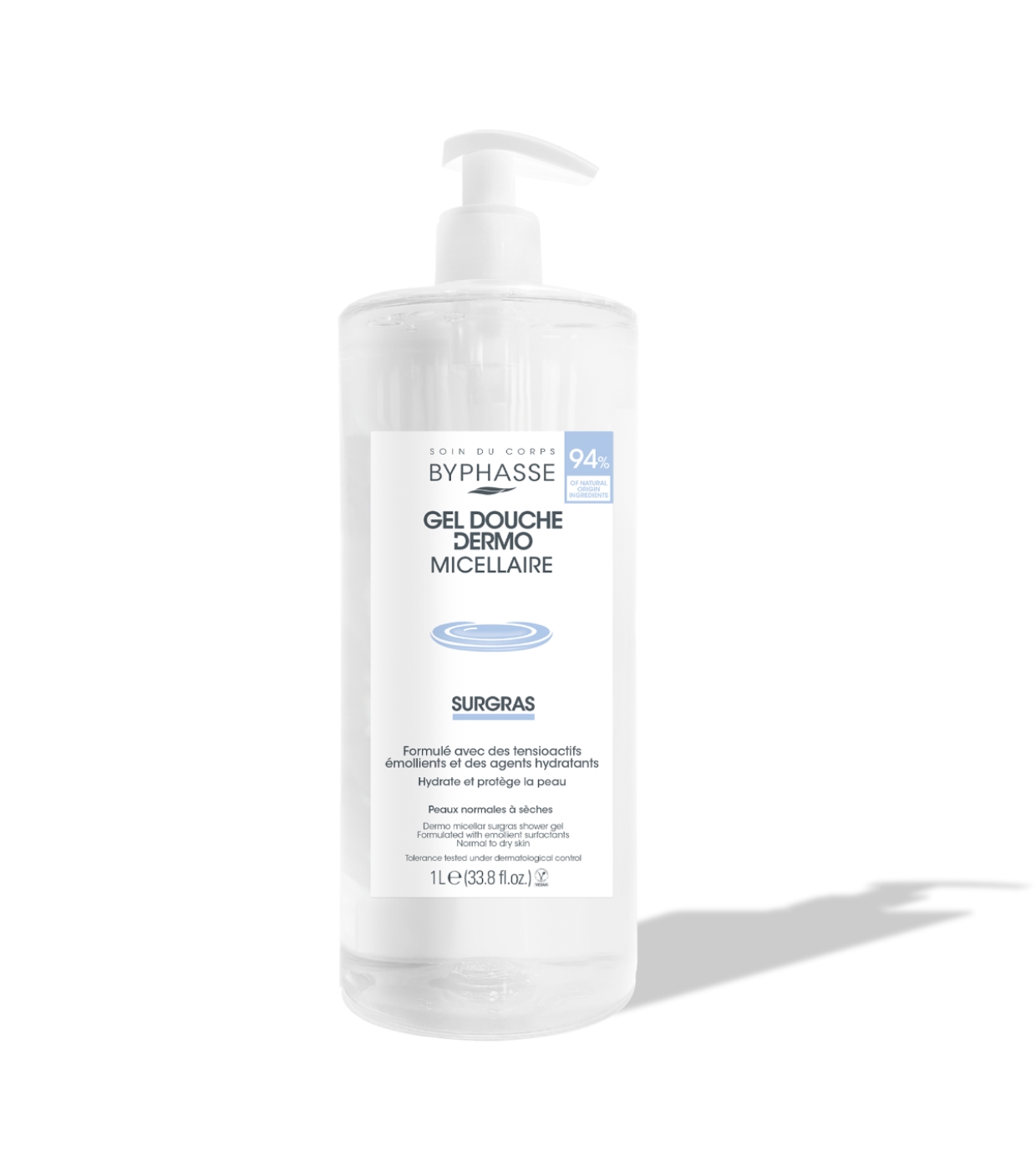 El gel de ducha Surgras de Byphasse está formulado con ingredientes suaves y un pH neutro que respeta el equilibrio natural de la piel tras cada ducha.