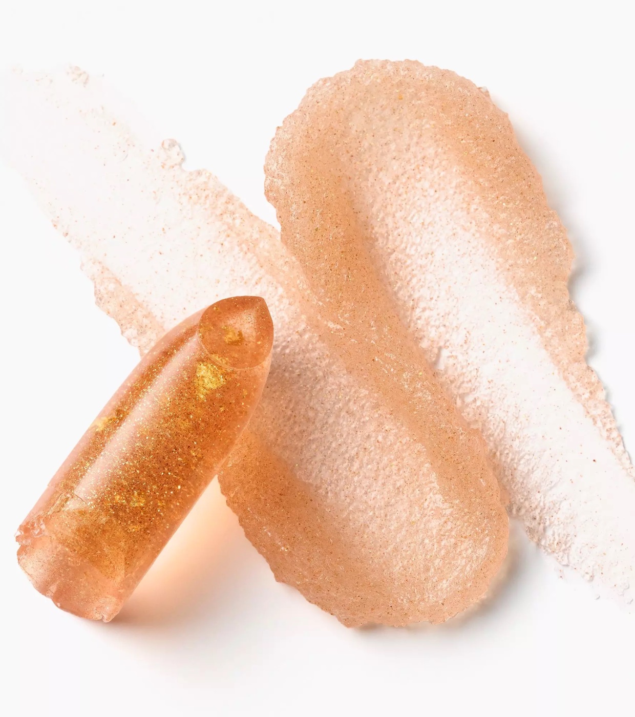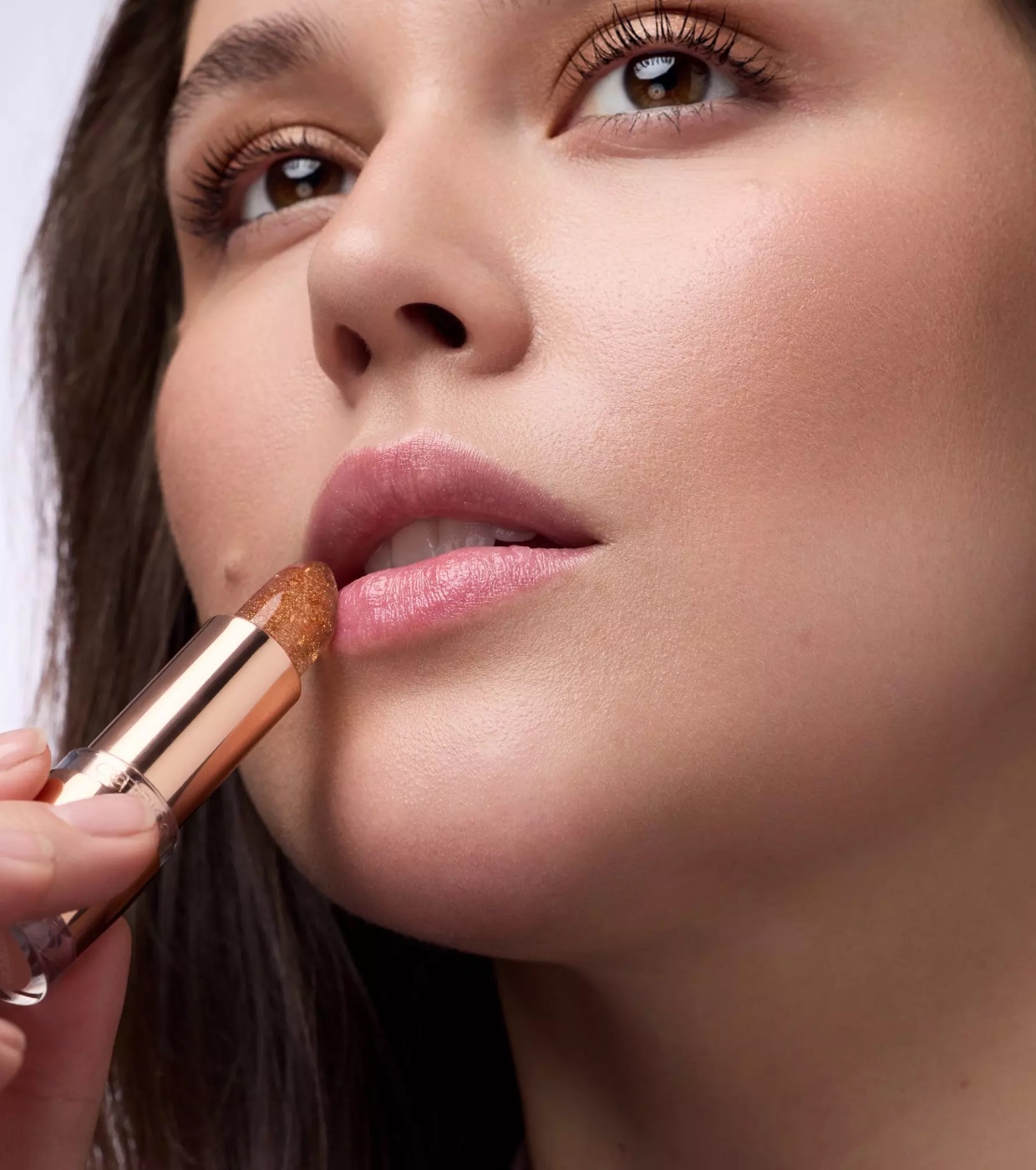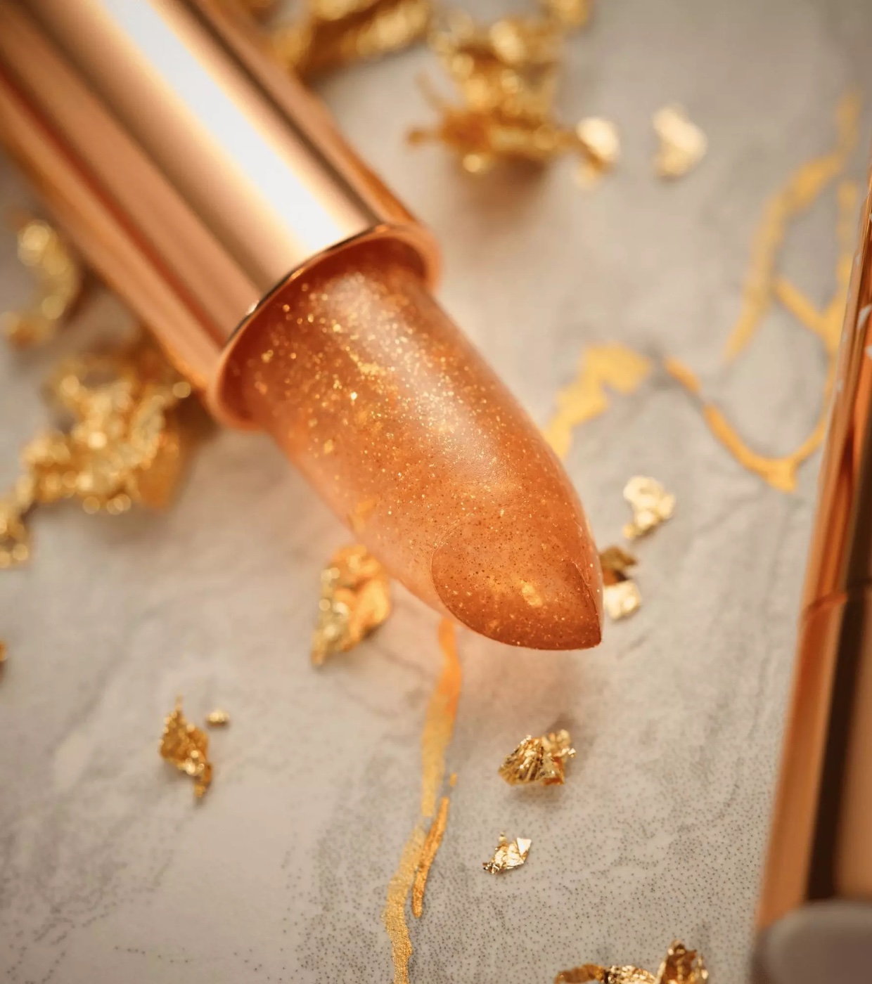 Su innovadora fórmula con glitter y hojas doradas no solo hidrata intensamente, sino que también transforma el color de tus labios con un tono rosa único, adaptándose a su pH natural.