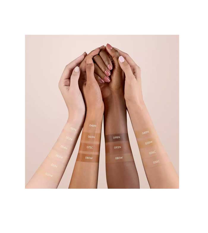 Sus pigmentos especialmente recubiertos garantizan una fijación de larga duración y una cobertura modulable de ligera a media para un cutis resplandeciente con un acabado mate natural.