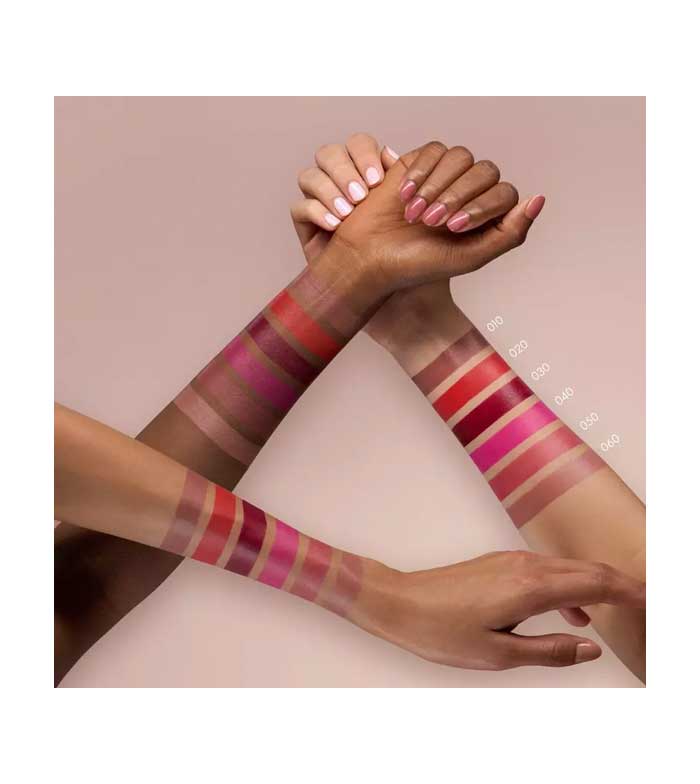 Su fórmula está enriquecida con aceite de ricino, manteca de karité y vitamina E y proporciona a los labios un acabado mate satinado.