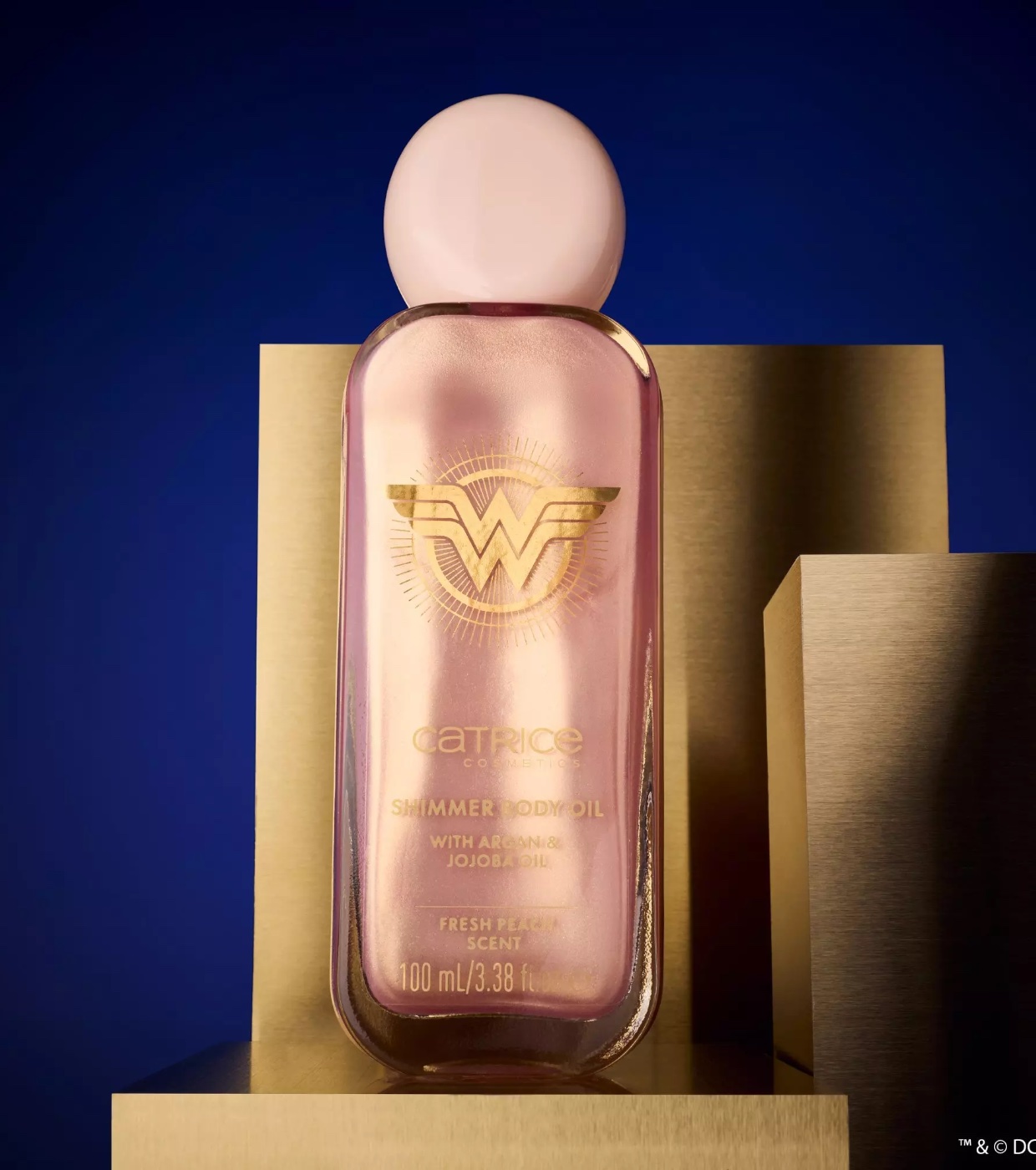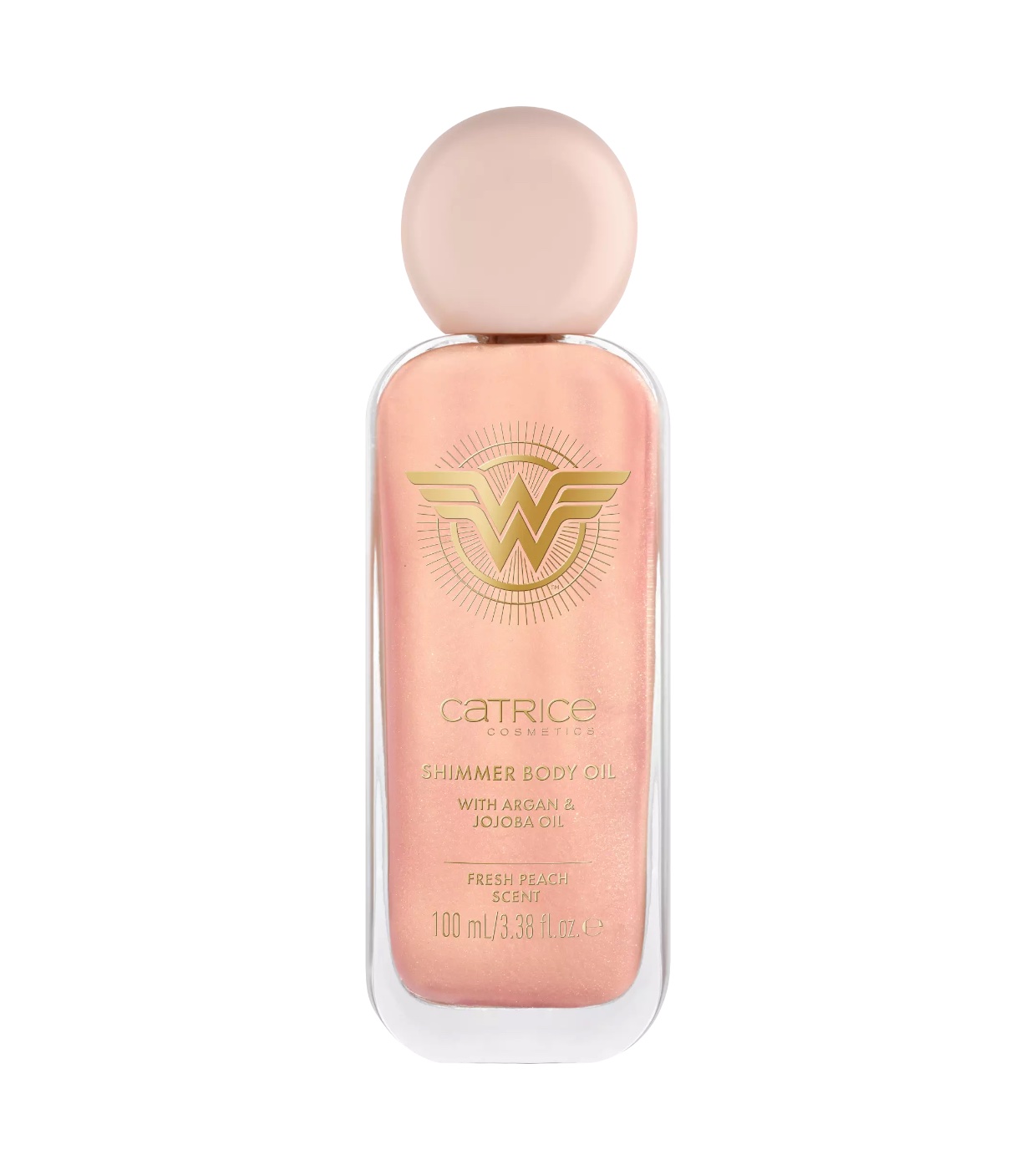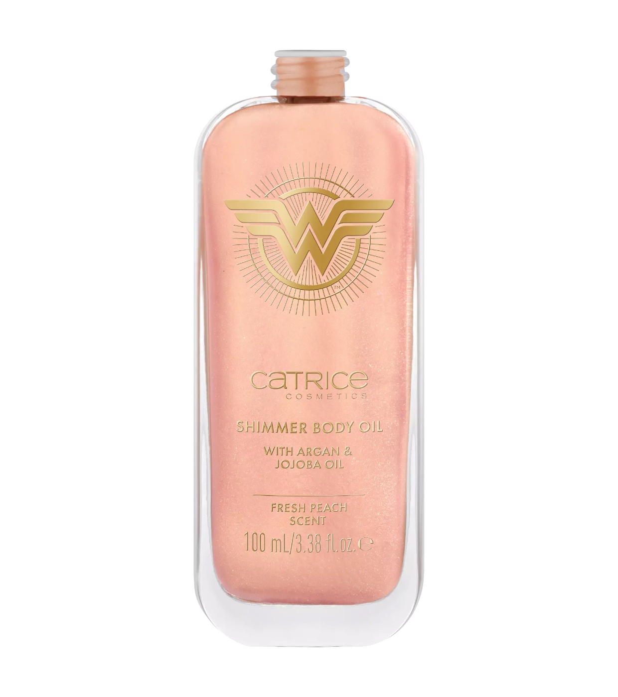 Descubre el lujo del aceite corporal de Catrice Wonder Woman 020 Sassy, un aceite corporal con una textura de oro rosado y partículas brillantes de color rosa dorado que transformarán tu piel, dándole un resplandor cálido y elegante.