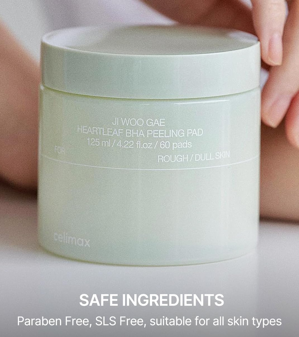 Consigue una piel más clara, luminosa y uniforme con estas almohadillas exfoliantes Heartleaf BHA de Celimax texturizadas con BHA, diseñadas para eliminar eficazmente las células muertas, impurezas y el exceso de sebo sin irritar la piel.