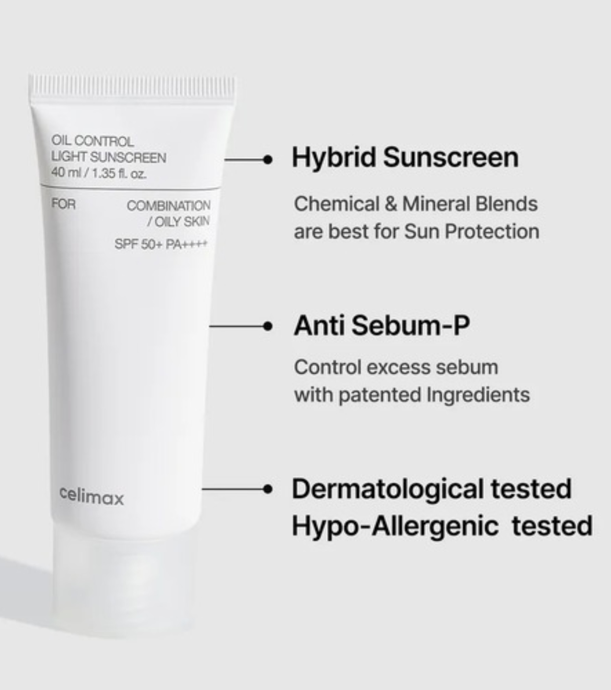 Oil Control Light Sunscreen SPF 50+ PA++++ de Celimax es un protector solar híbrido de última generación, especialmente formulado para pieles mixtas, grasas y con tendencia acneica.
