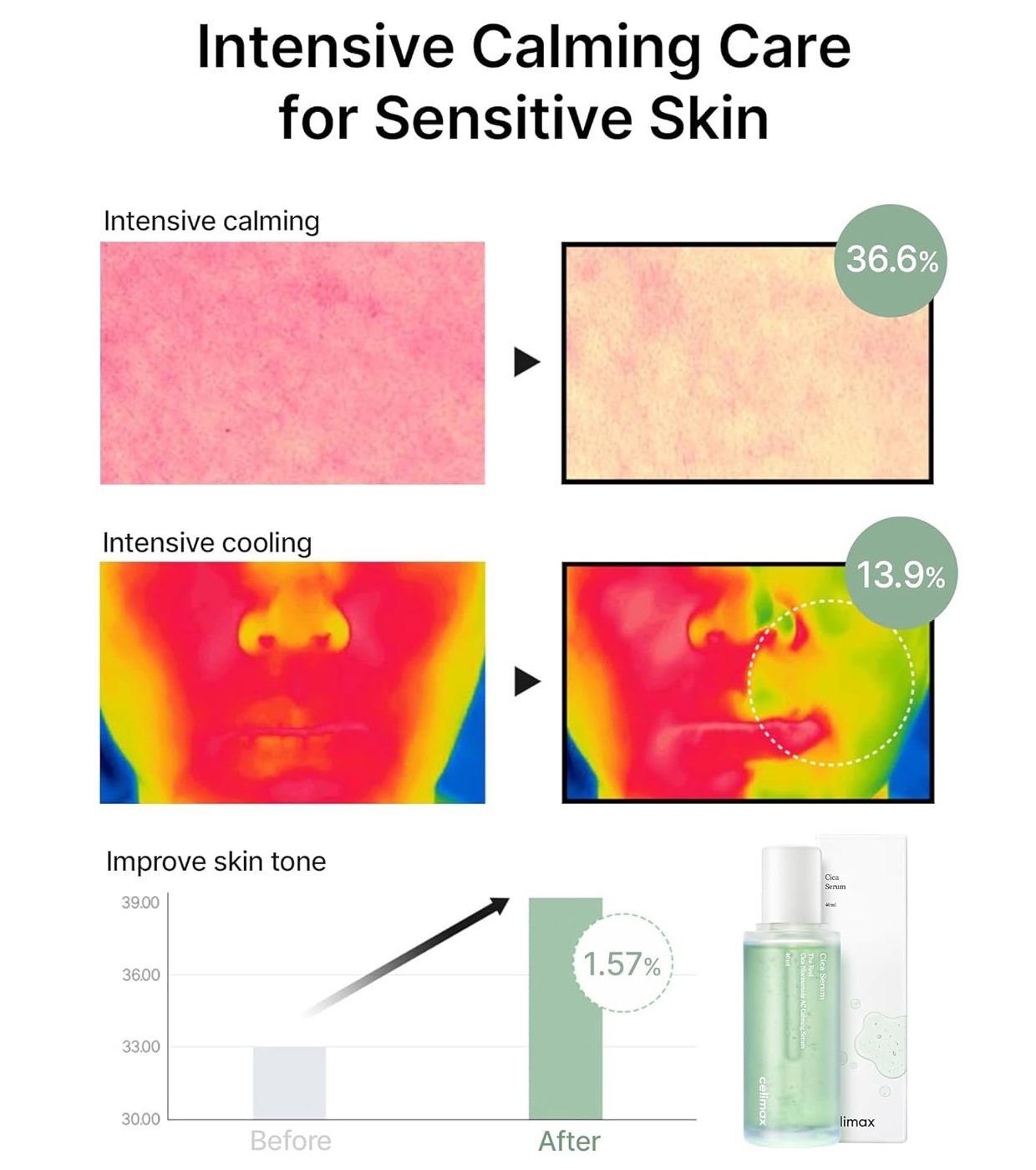 Con un 75 % de extracto de Centella Asiática, ayuda a reducir rojeces e irritaciones, fortalece la barrera cutánea y favorece la regeneración de la piel.