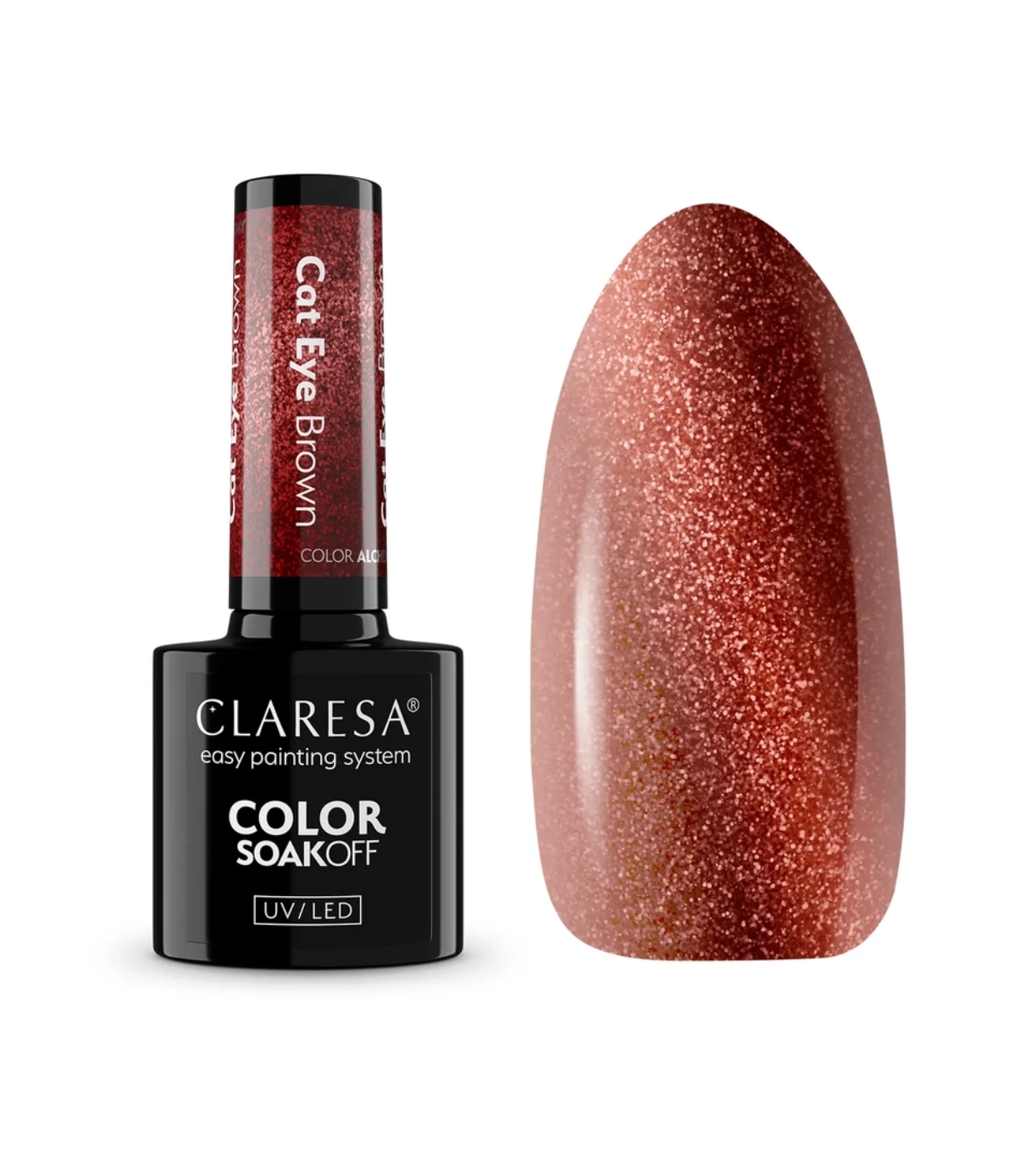 El esmalte semipermanente de Claresa con acabado “Ojo de Gato” crea el famoso efecto cat eye al acercar el imán, generando un reflejo luminoso tipo piedra preciosa que cambia con el movimiento de la mano y se ve espectacular bajo cualquier luz.