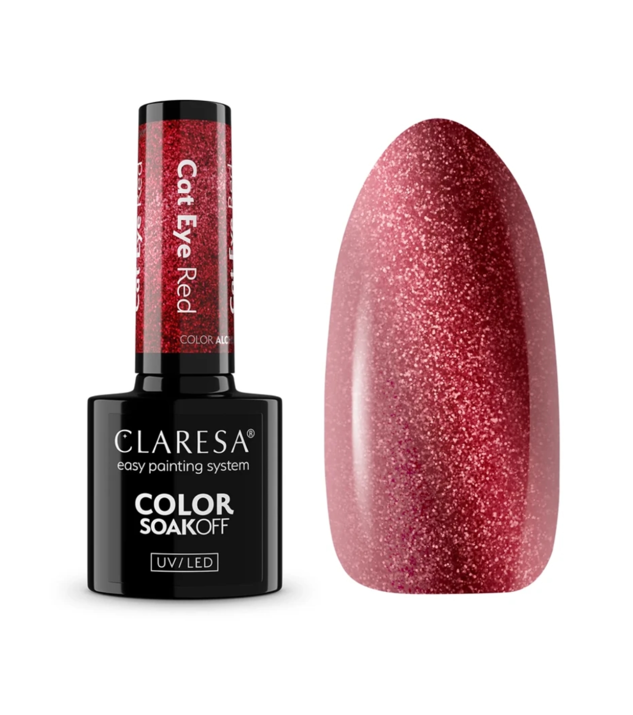 El esmalte semipermanente de Claresa con acabado “Ojo de Gato” crea el famoso efecto cat eye al acercar el imán, generando un reflejo luminoso tipo piedra preciosa que cambia con el movimiento de la mano y se ve espectacular bajo cualquier luz.