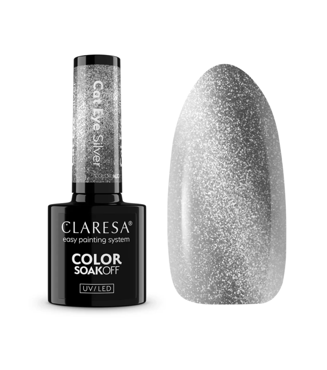 El esmalte semipermanente de Claresa con acabado “Ojo de Gato” crea el famoso efecto cat eye al acercar el imán, generando un reflejo luminoso tipo piedra preciosa que cambia con el movimiento de la mano y se ve espectacular bajo cualquier luz.
