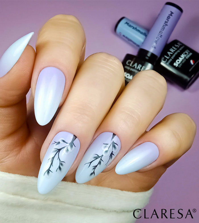Sobre la base de Claresa previamente aplicada y curada, aplicar una fina capa de esmalte semipermanente y secar en lámpara UV/LED. Para lograr un efecto más perfecto, se puede repetir la actividad. Después se debe aplicar el top coat y curar de nuevo en la lámpara de luz.