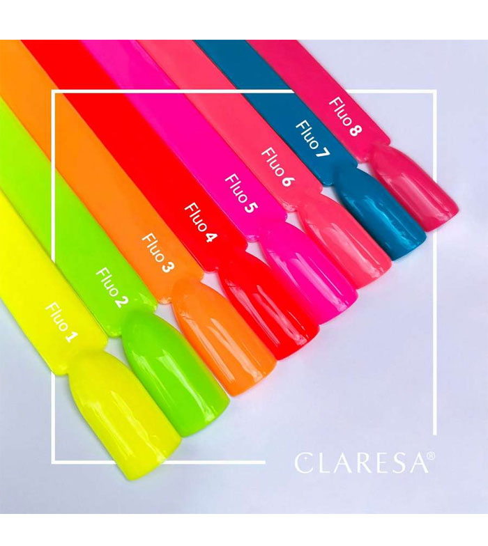 Los esmaltes semipermanentes de la gama Fluo de Claresa tienen unos colores vibrantes y llenos de energía que nos inspiran a disfrutar del sol con una manicura que no pasará desapercibida.