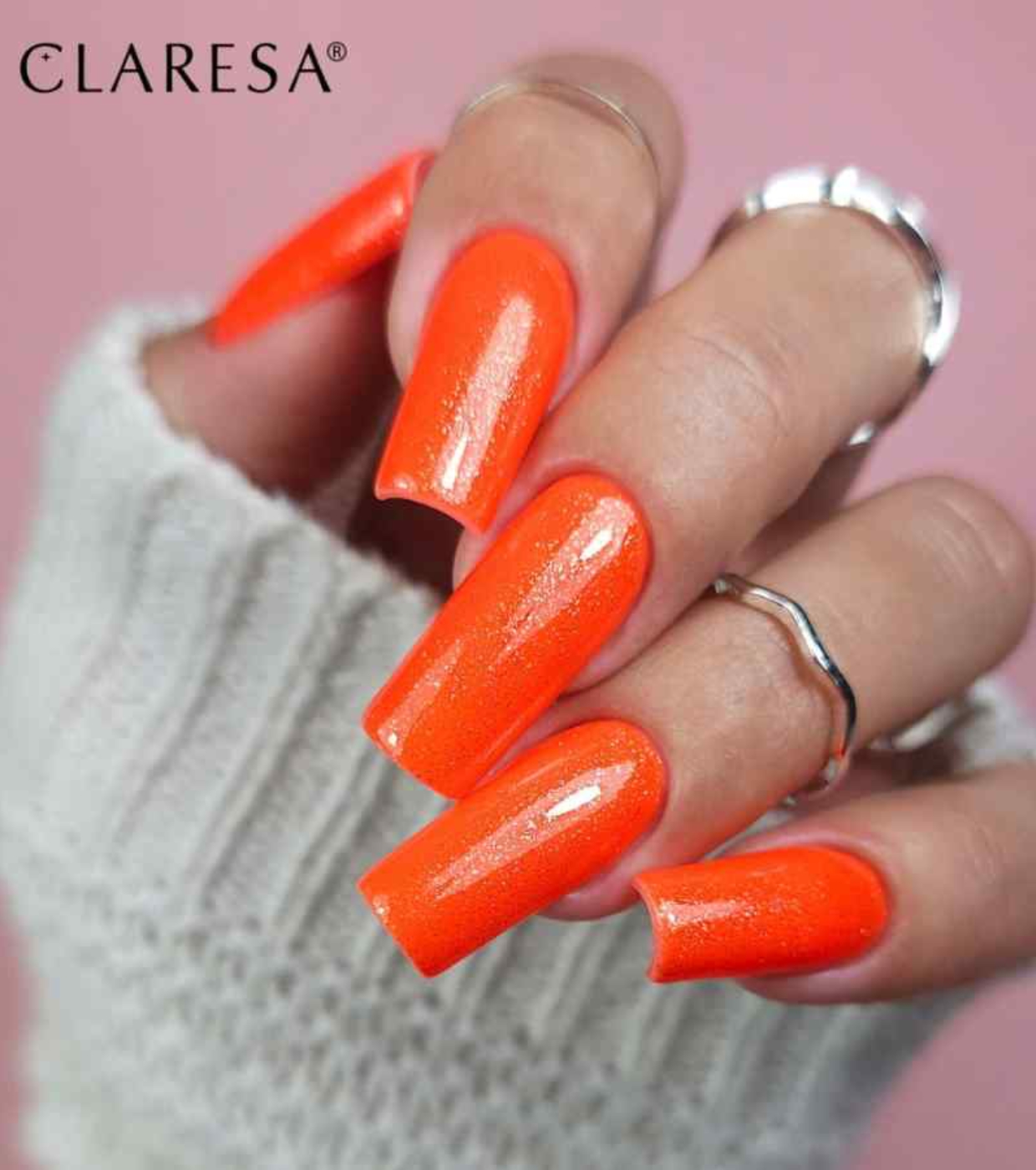 La colección Funky Disco de Claresa incluye 7 esmaltes semipermanentes en vibrantes tonos de rosa, naranja, amarillo, verde, azul y morado, todos adornados con miles de partículas brillantes.