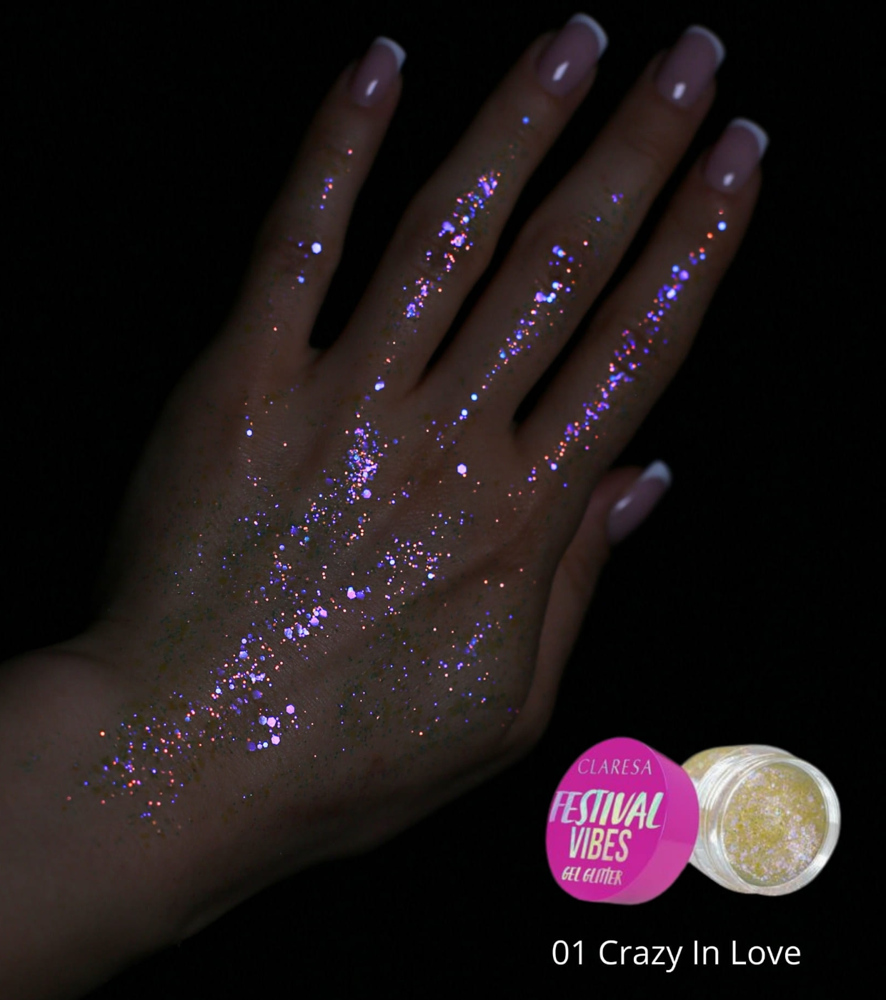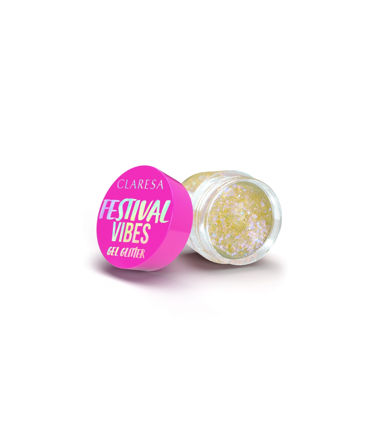 Siente la energía de los festivales en tu piel con el Glitter en gel Festival Vibes de Claresa, la purpurina en gel que transforma cualquier look en una explosión de luz y color.