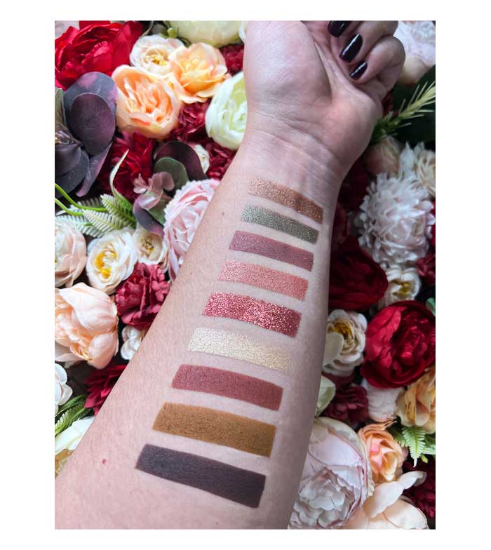 Una paleta formada por 9 sombras en diversidad de acabados que van desde los tonos mate a metalizados y glitter.