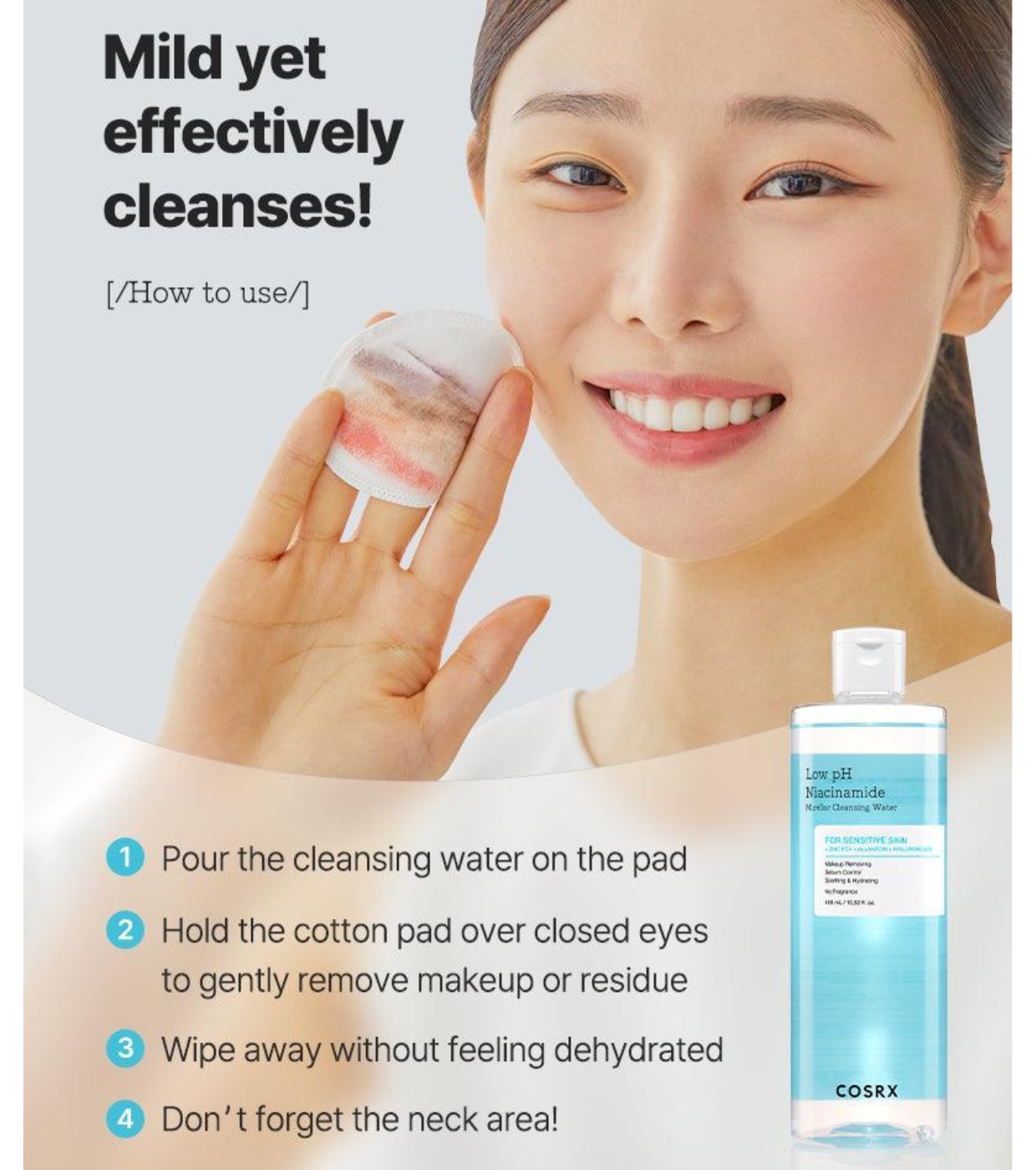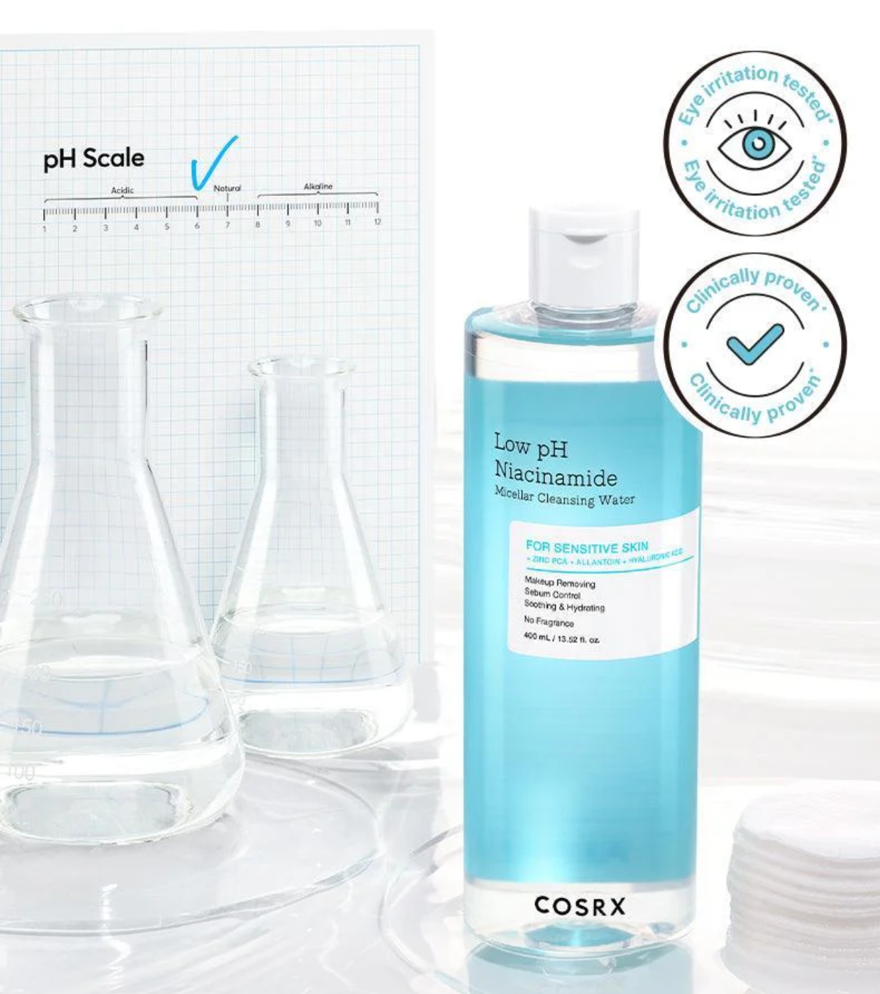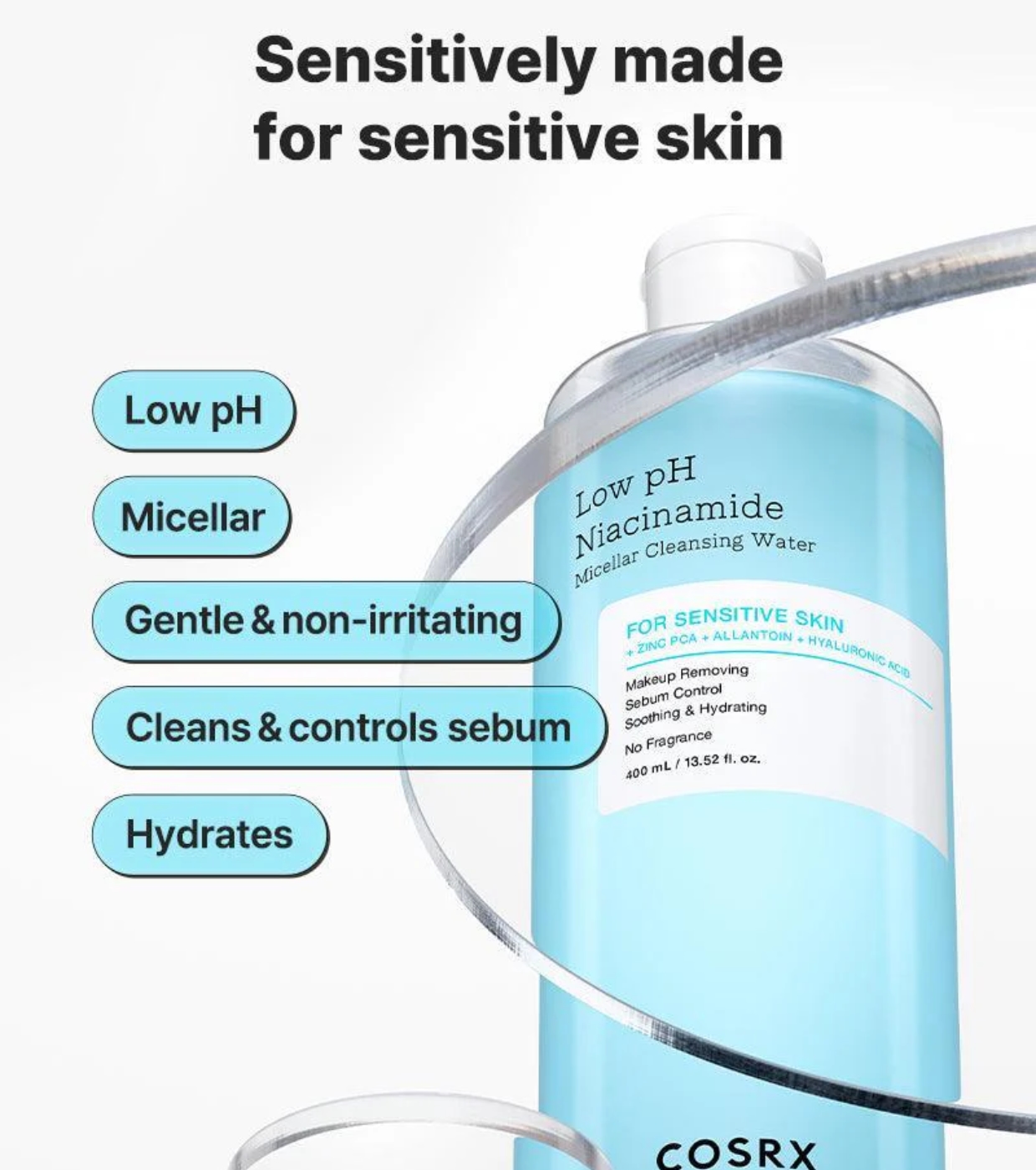 Esta agua micelar limpiadora con Niacinamida Low PH de COSRX es perfecta para pieles sensibles, gracias a su fórmula suave con niacinamida, que elimina delicadamente el maquillaje, las impurezas y controla el exceso de sebo.