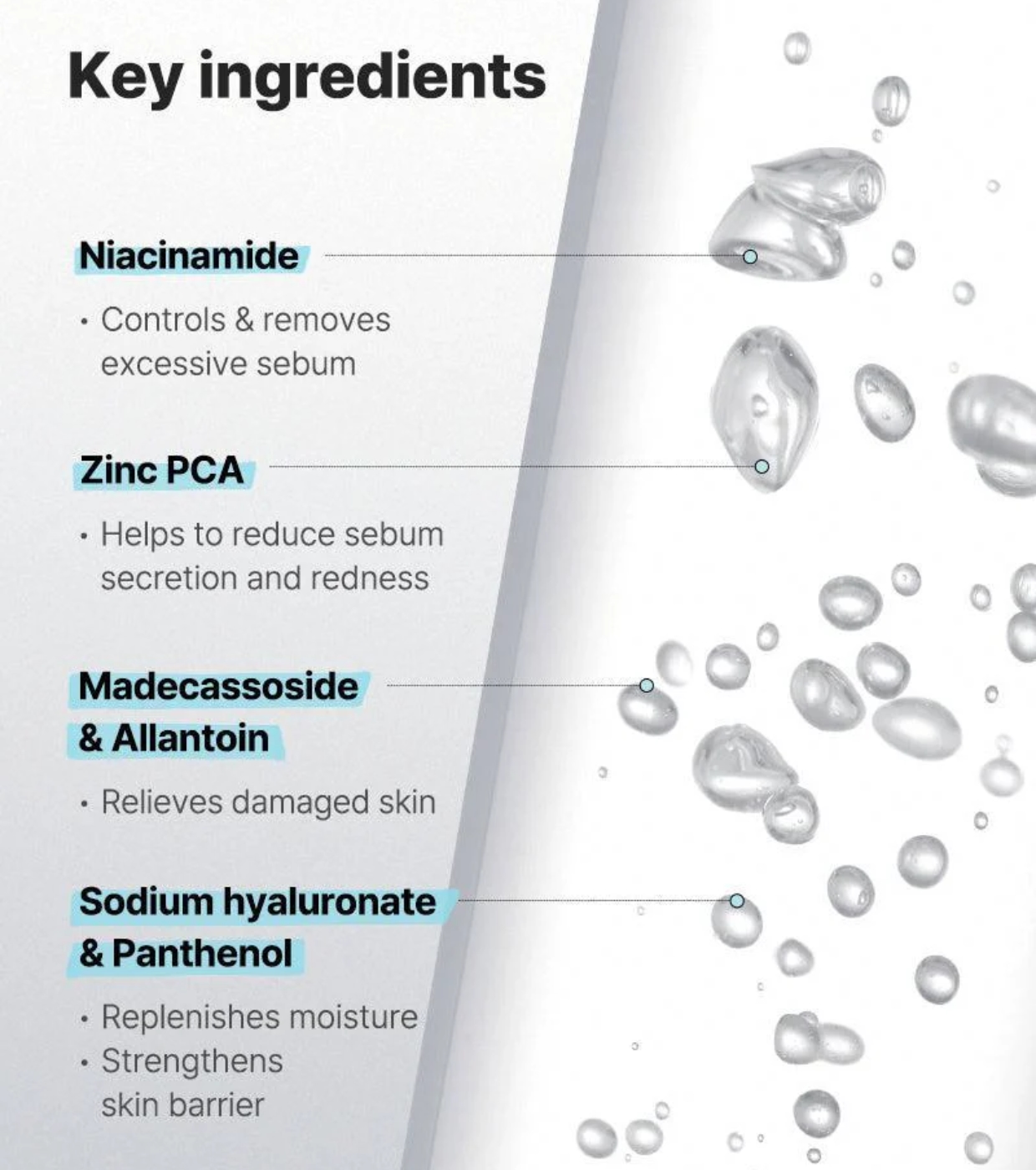 Aqua, Dipropylene Glycol, Polyglyceryl-4 Caprate, Panthenol, Sodium Hyaluronate, Allantoin, Niacinamide(1,000ppm), Zinc PCA, Madecassoside, Propanediol, Caprylyl Glycol, Ethylhexylglycerin, 1,2-Hexanediol, Sodium Citrate, Citric Acid, Disodium EDTA