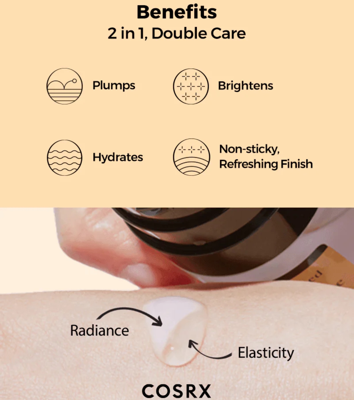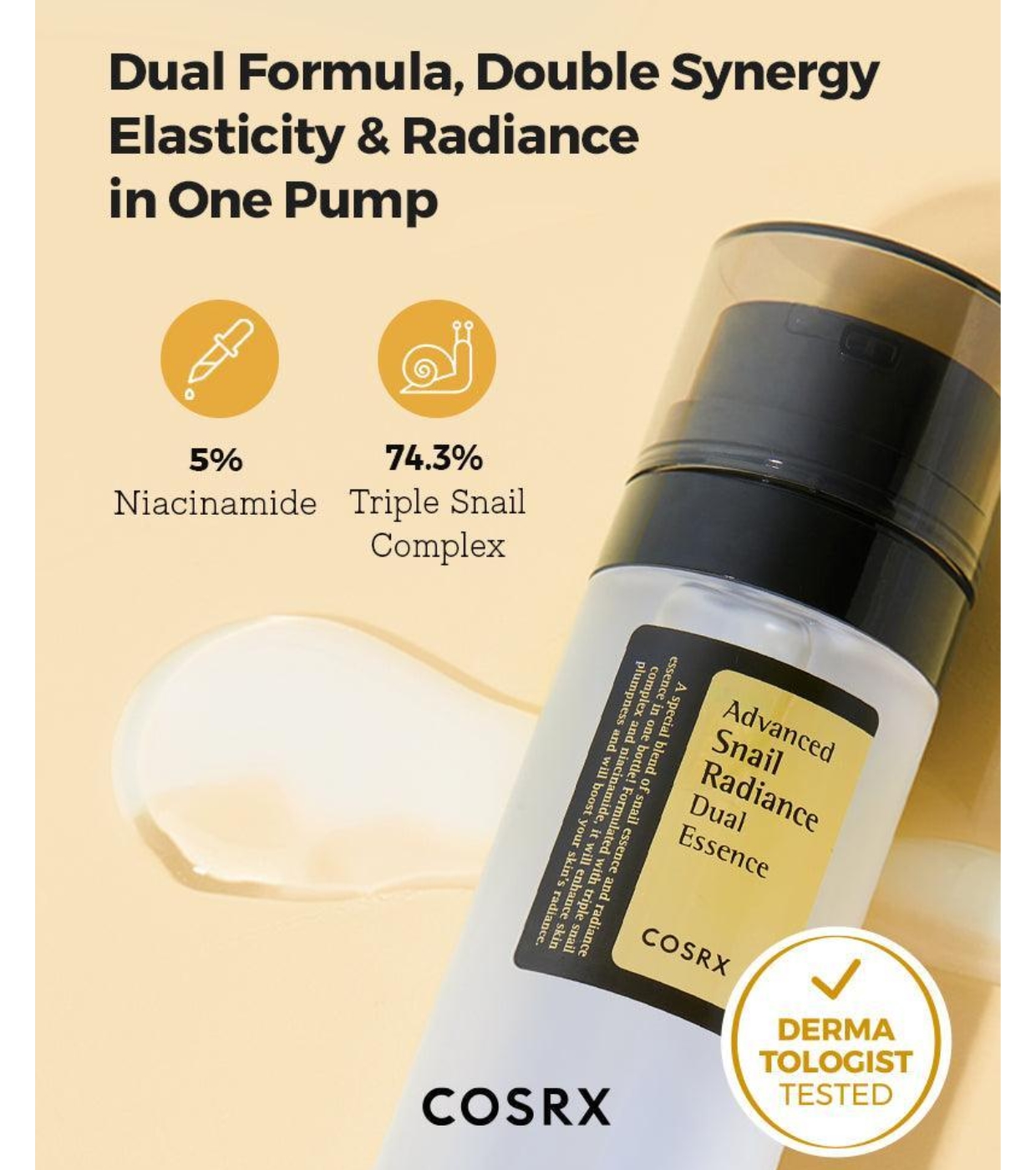 Transforma tu rutina de cuidado de la piel con esta innovadora esencia iluminadora Advanced Snail Radiance Dual Essence de COSRX, que mezcla la potente esencia de caracol con una esencia iluminadora en cada aplicación.