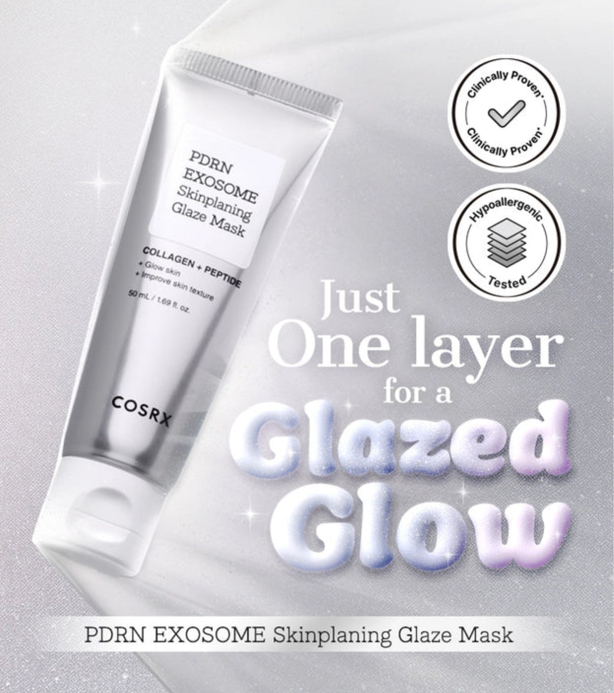 La mascarilla peel-off PDRN EXOSOME Skinplaning Glaze de COSRX que transforma la piel apagada en un acabado jugoso, firme y luminoso desde el primer uso.