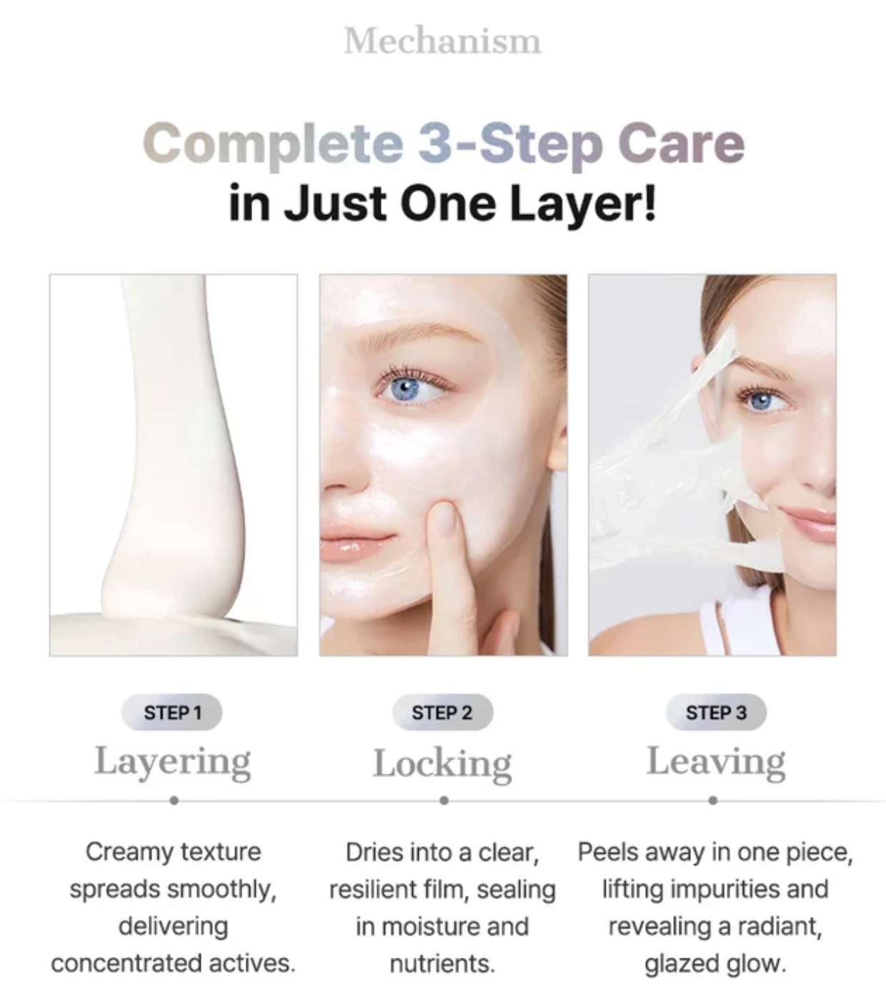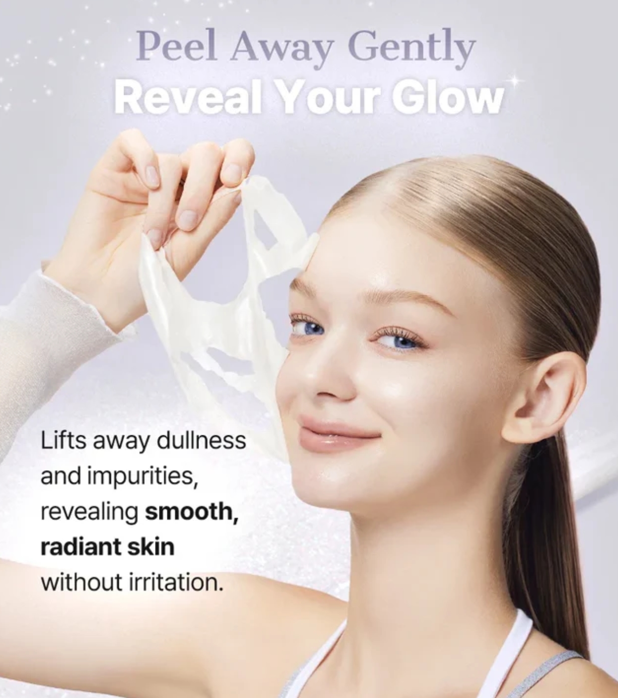 Al aplicarla, se extiende en una capa uniforme que, al secarse, se transforma en una película transparente tipo peel-off. Al retirarla, la piel se siente más lisa, hidratada y visiblemente más luminosa, sin dejar sensación pegajosa.