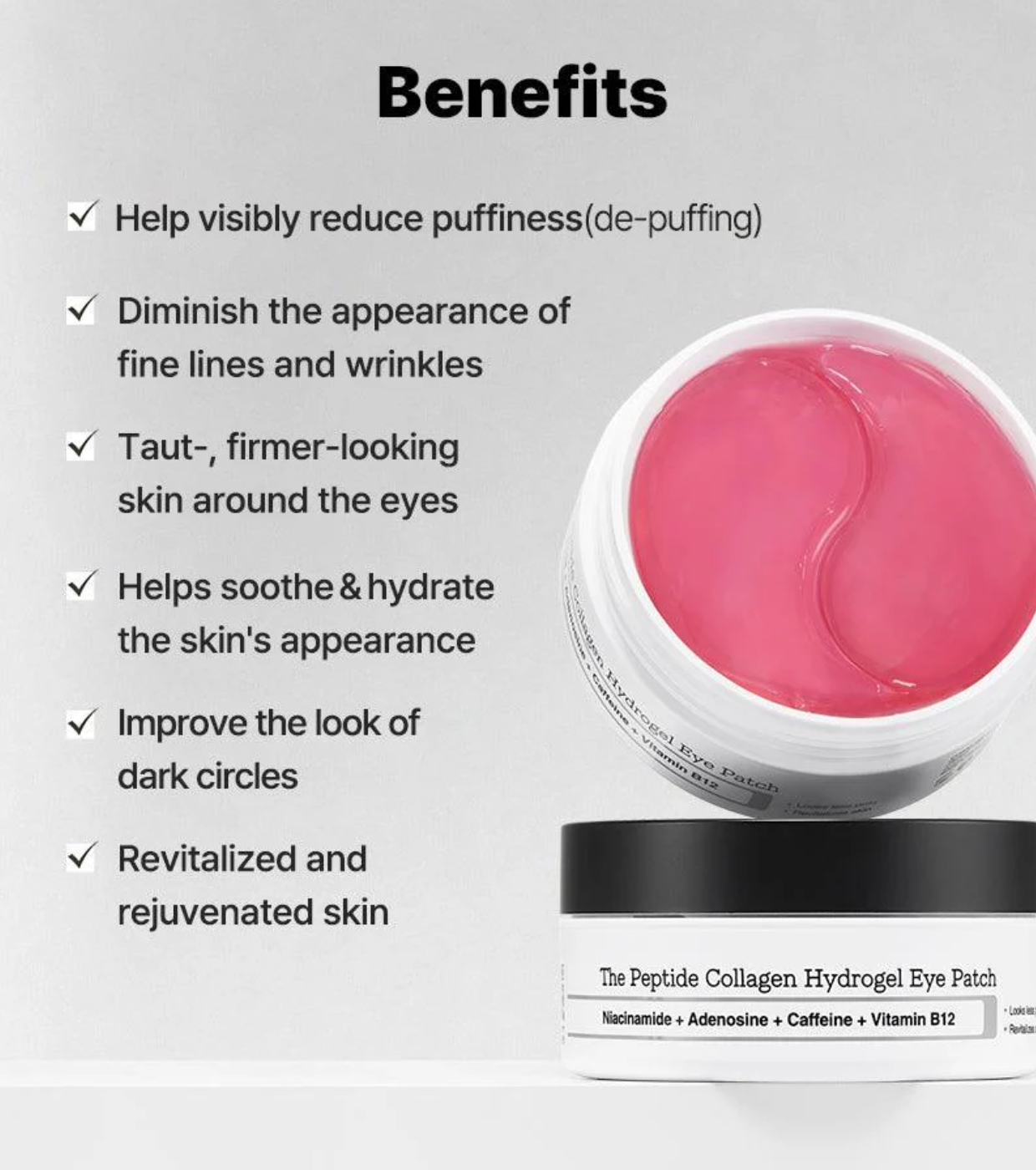 Estos innovadores parches están formulados con un potente complejo de péptidos y colágeno, dos ingredientes clave para combatir los signos de envejecimiento, reducir la hinchazón y proporcionar una hidratación profunda y duradera.