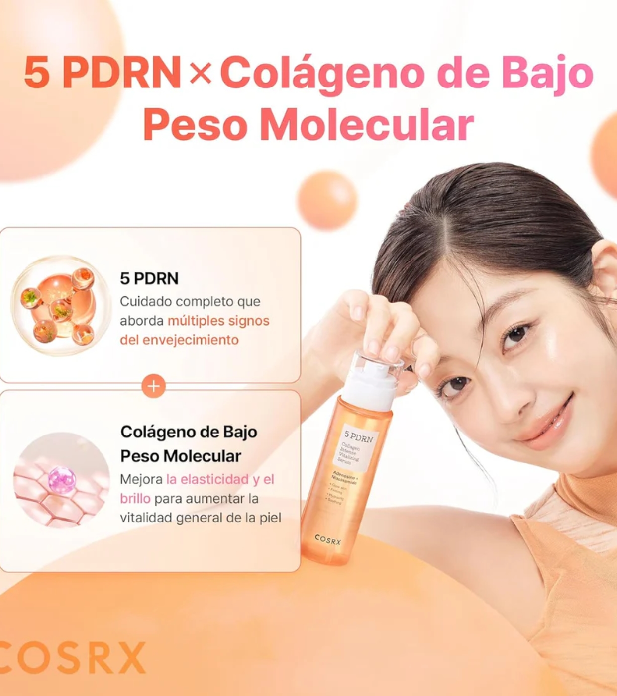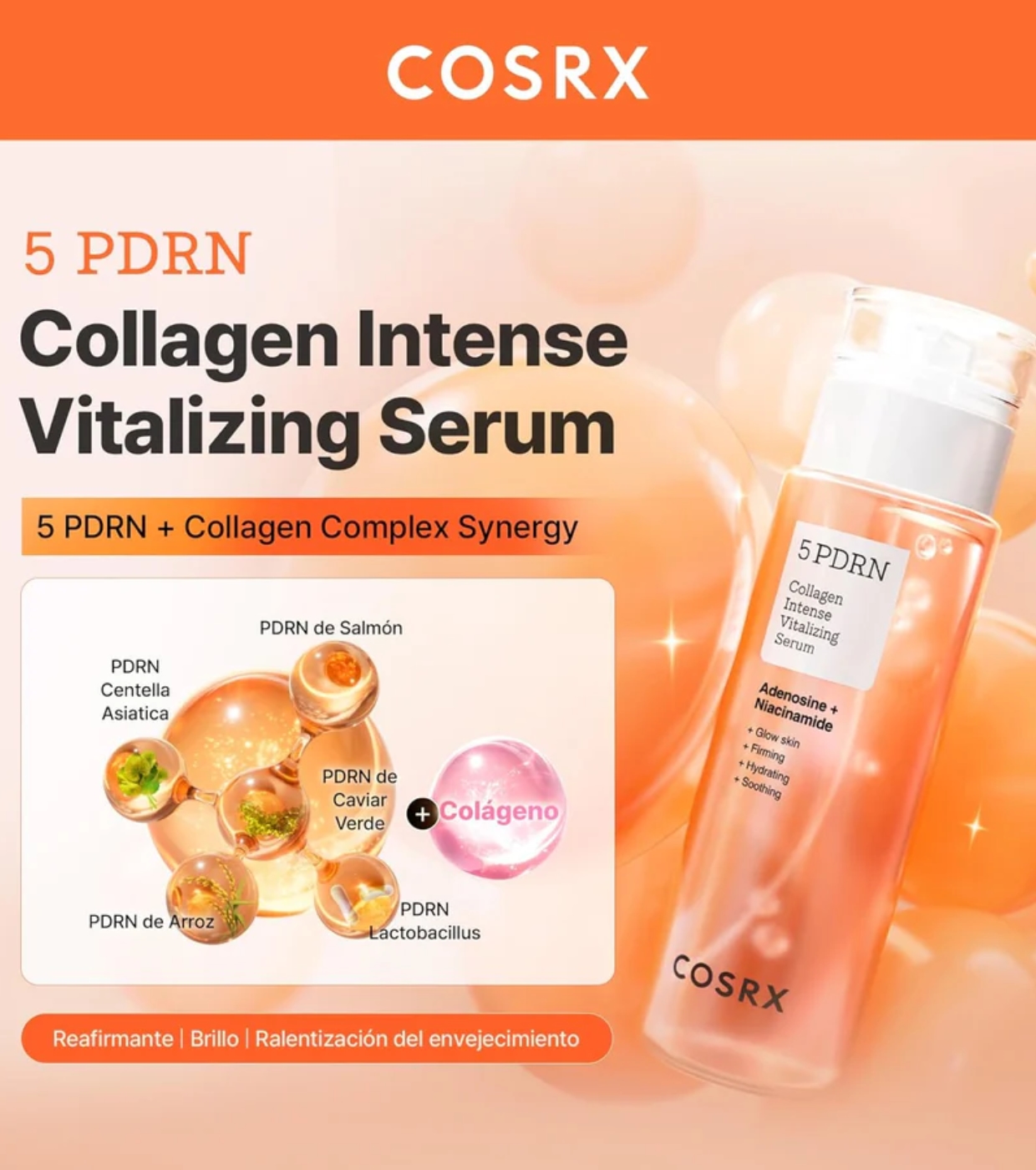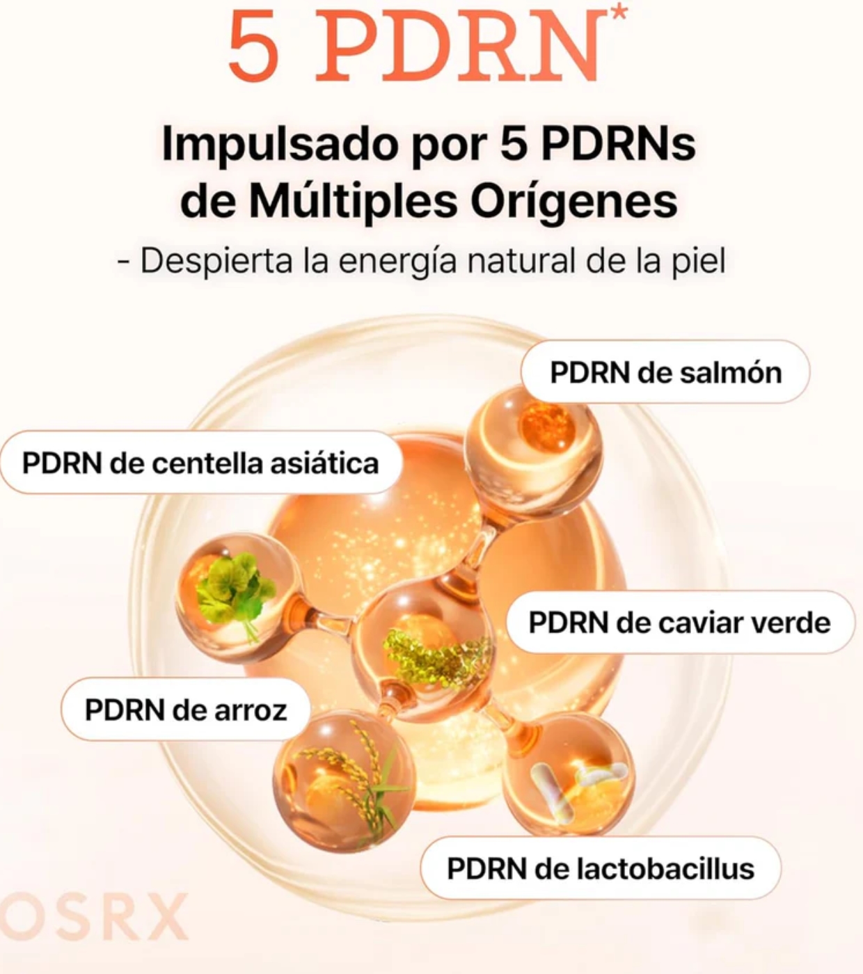 Incorpora 5 tipos de PDRN (derivados de salmón, centella asiática, arroz, lactobacillus y uva de mar), conocidos por su capacidad para estimular la regeneración de la piel, mejorar la elasticidad y ayudar a reducir los signos de envejecimiento.
