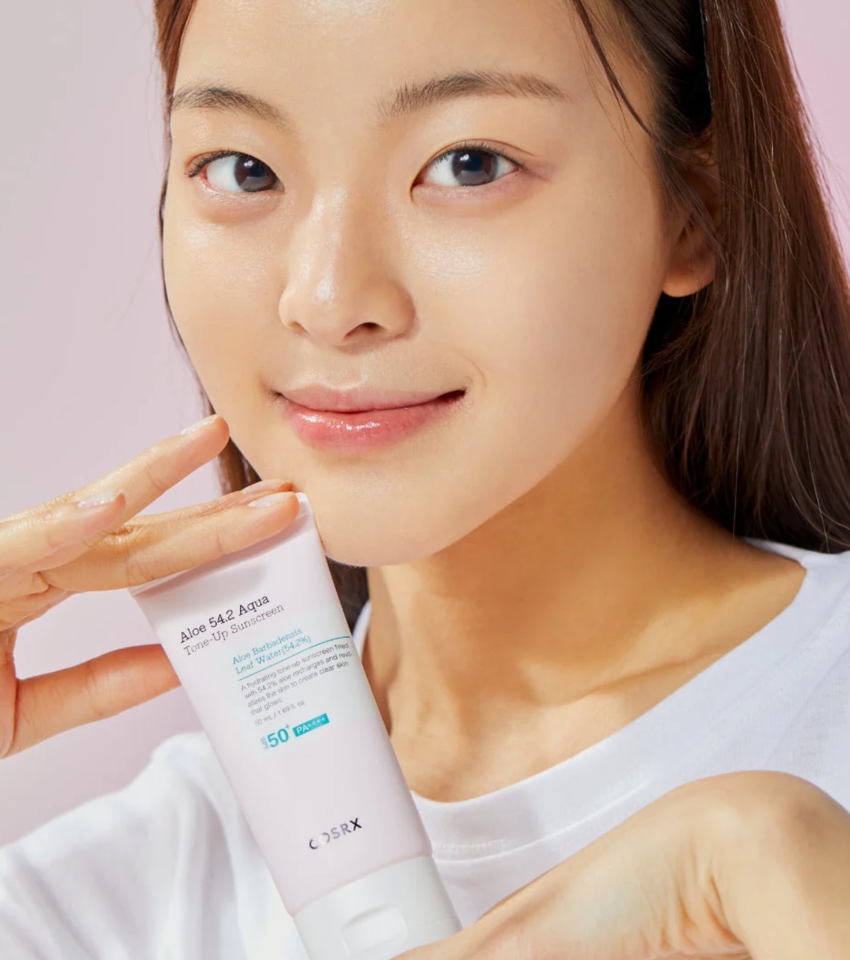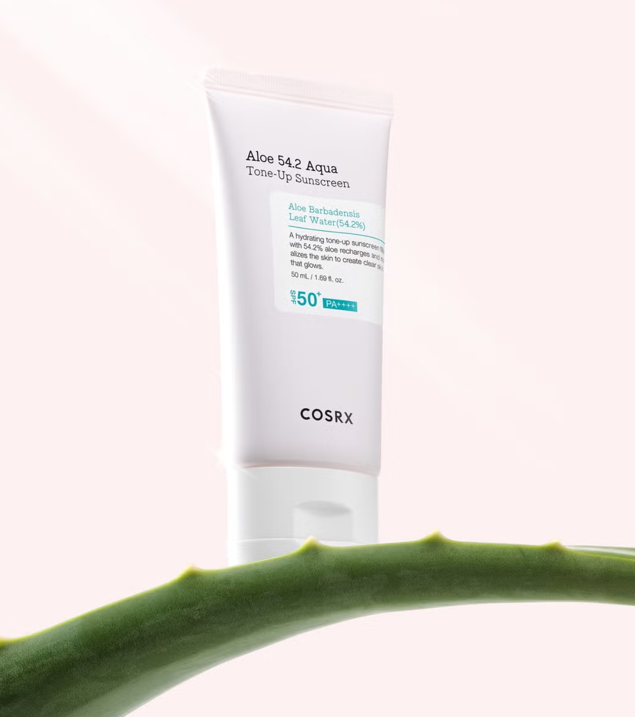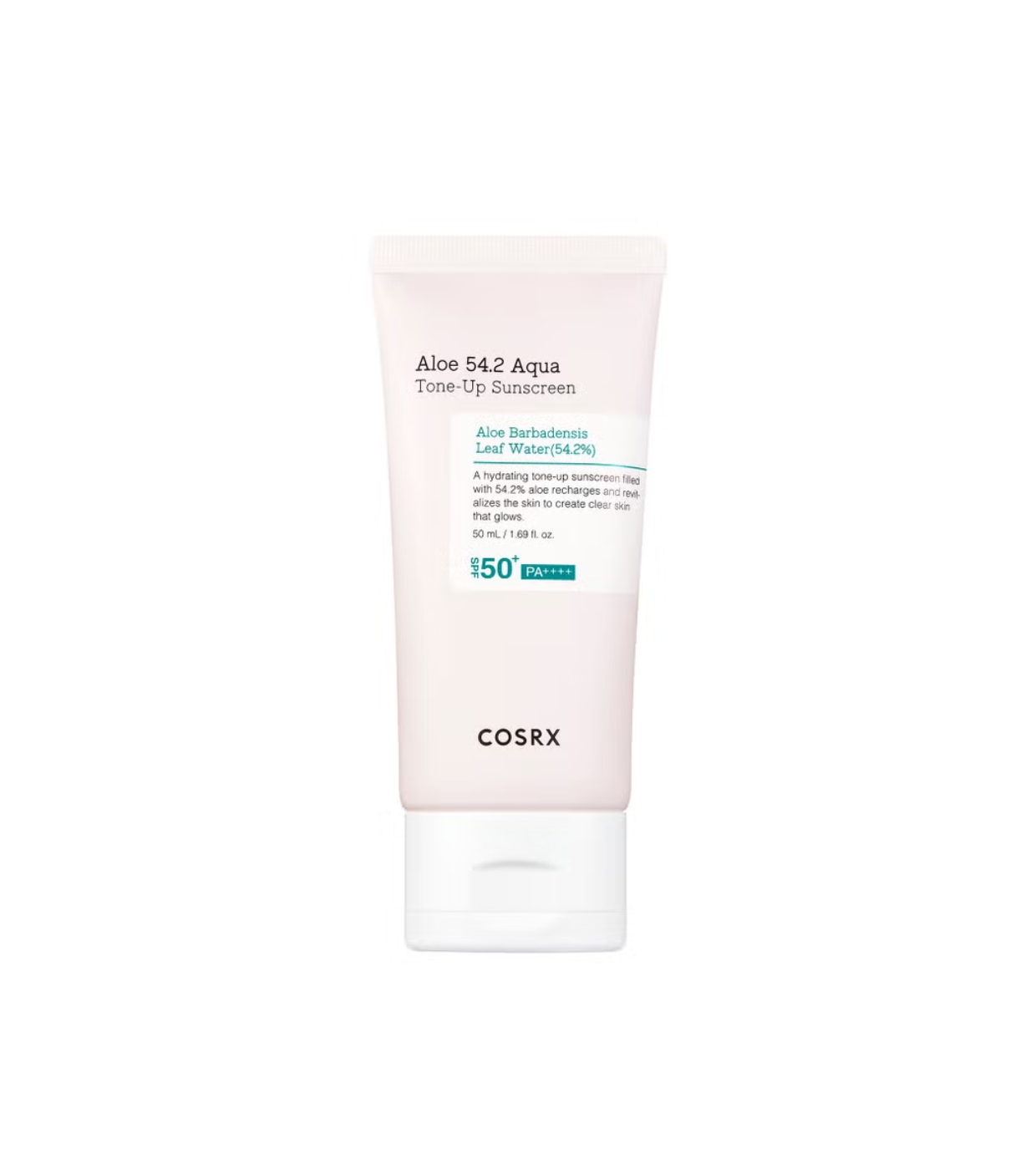 El protector solar ligero SPF50+ Aloe 54.2 Aqua de COSRX con efecto tono uniforme que protege la piel frente a los rayos UV mientras aporta un acabado luminoso y natural.
