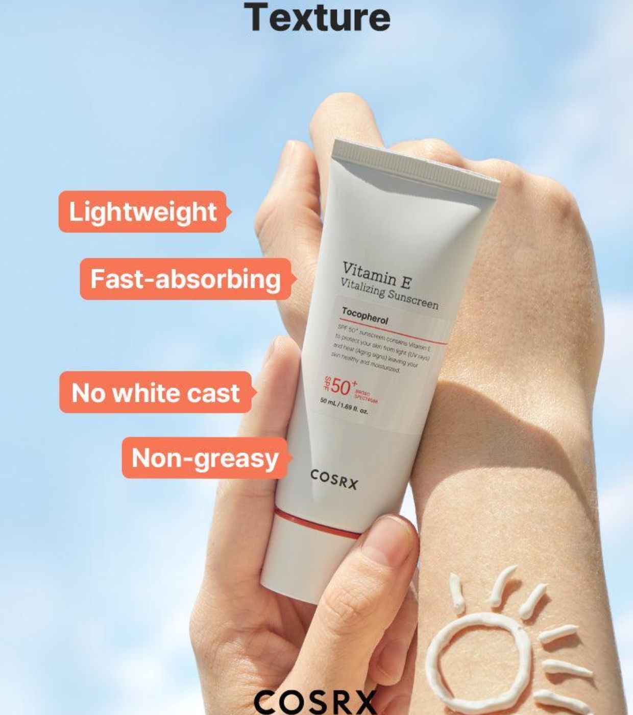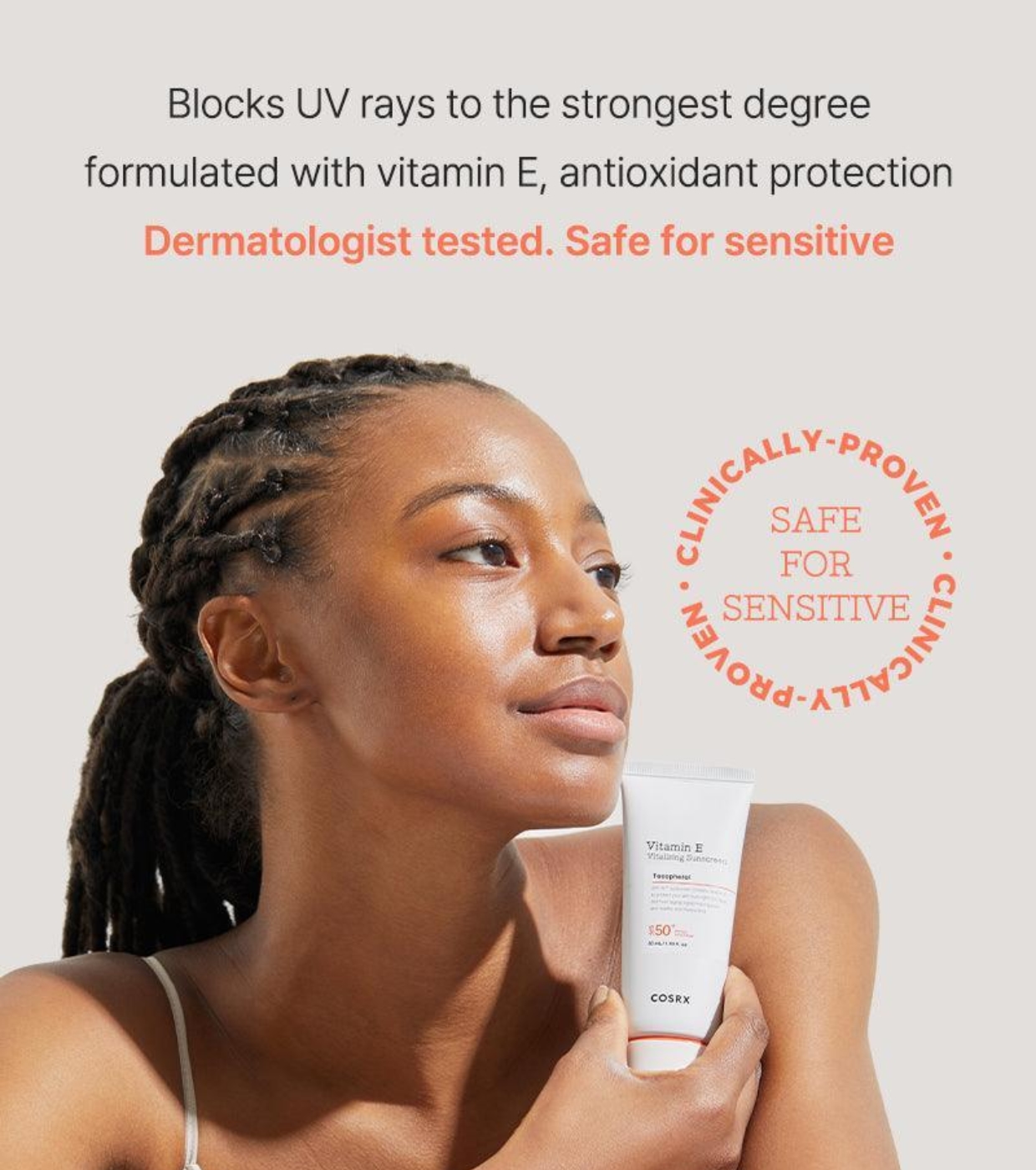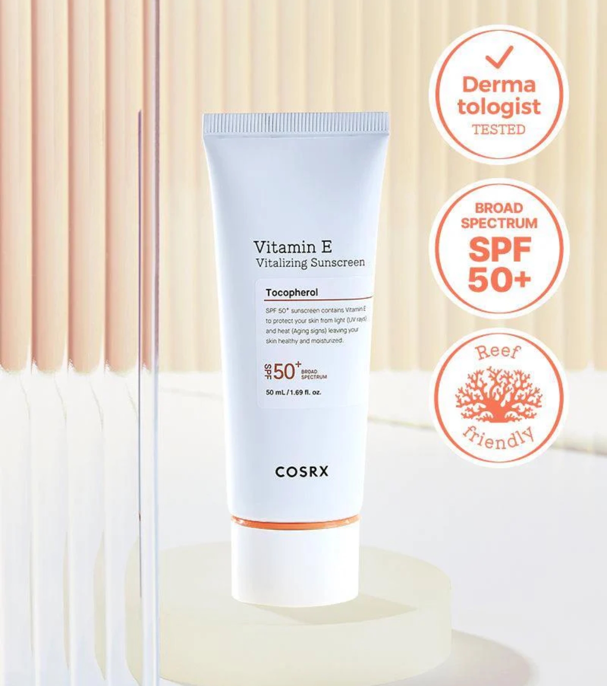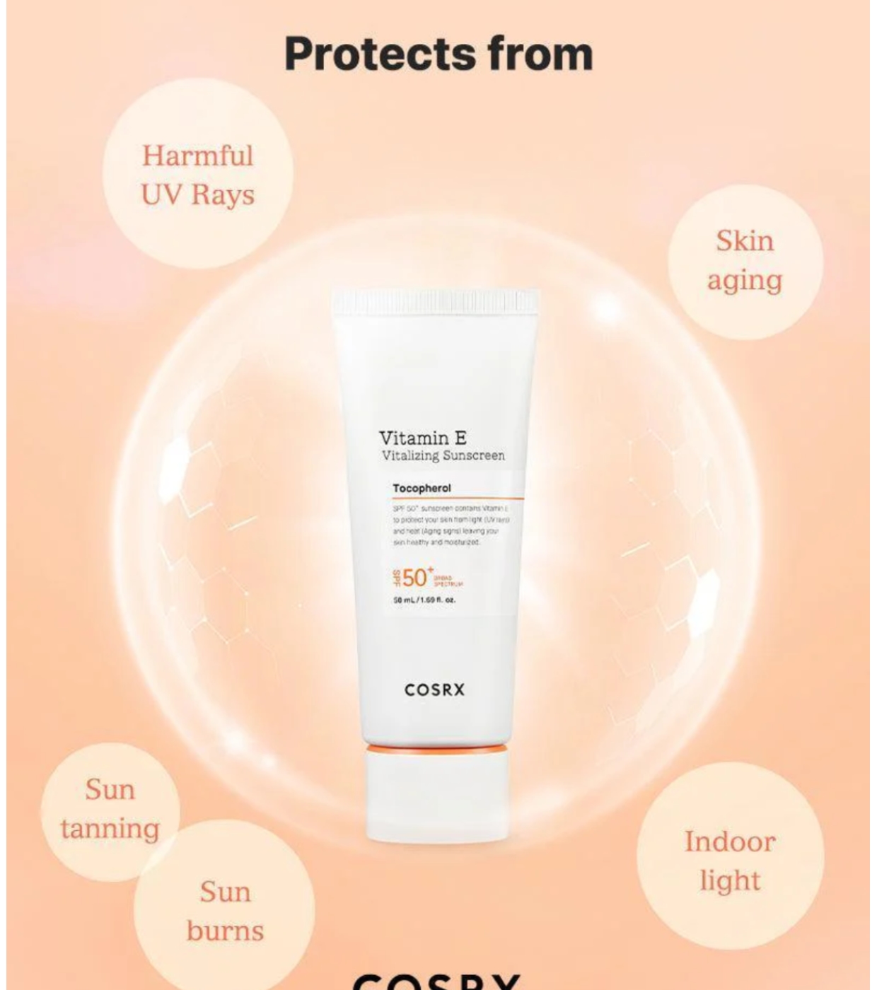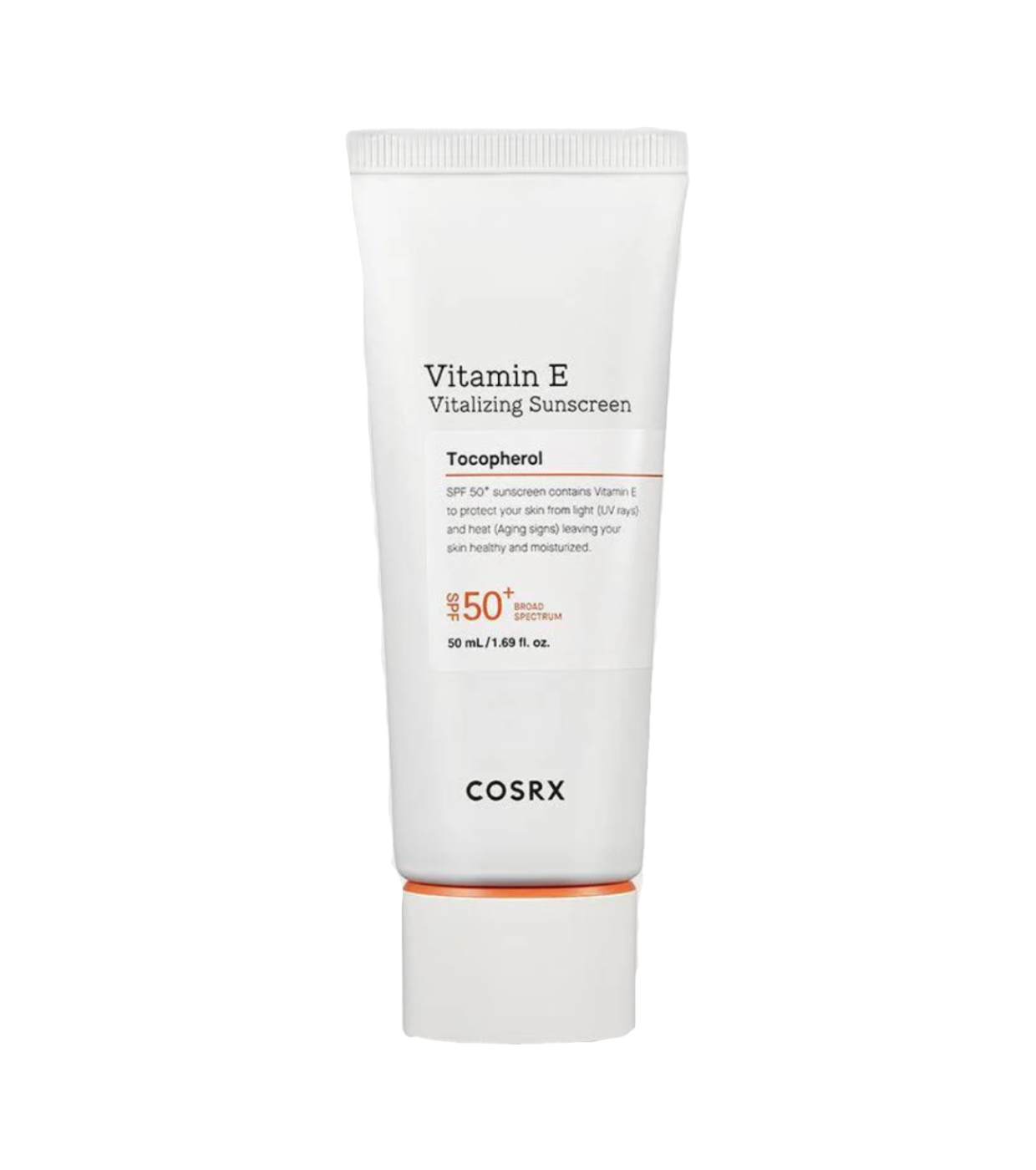 Este protector solar facial SPF50+ [Vitamin E Tocopherol] de [COSRX] de alta eficacia bloquea los rayos UV con el mayor grado de protección, al tiempo que está formulado con vitamina E y protección antioxidante.