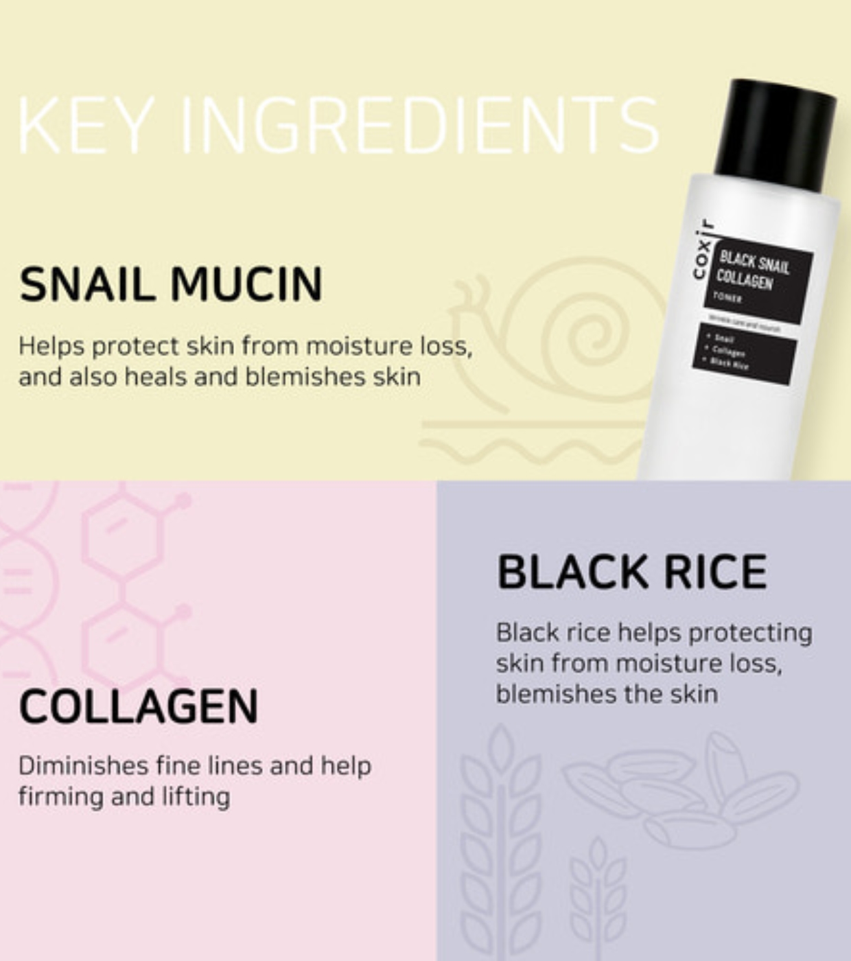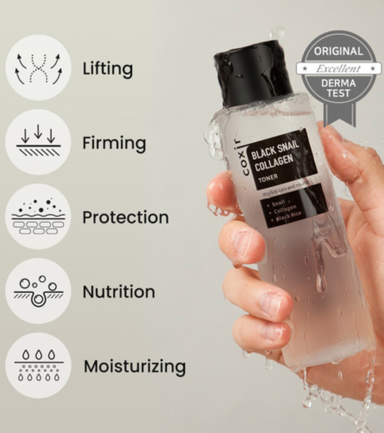 Este tónico Black Snail Collagen de COXIR es la solución perfecta para equilibrar y mejorar la textura de la piel, revelando un cutis luminoso, suave y saludable.