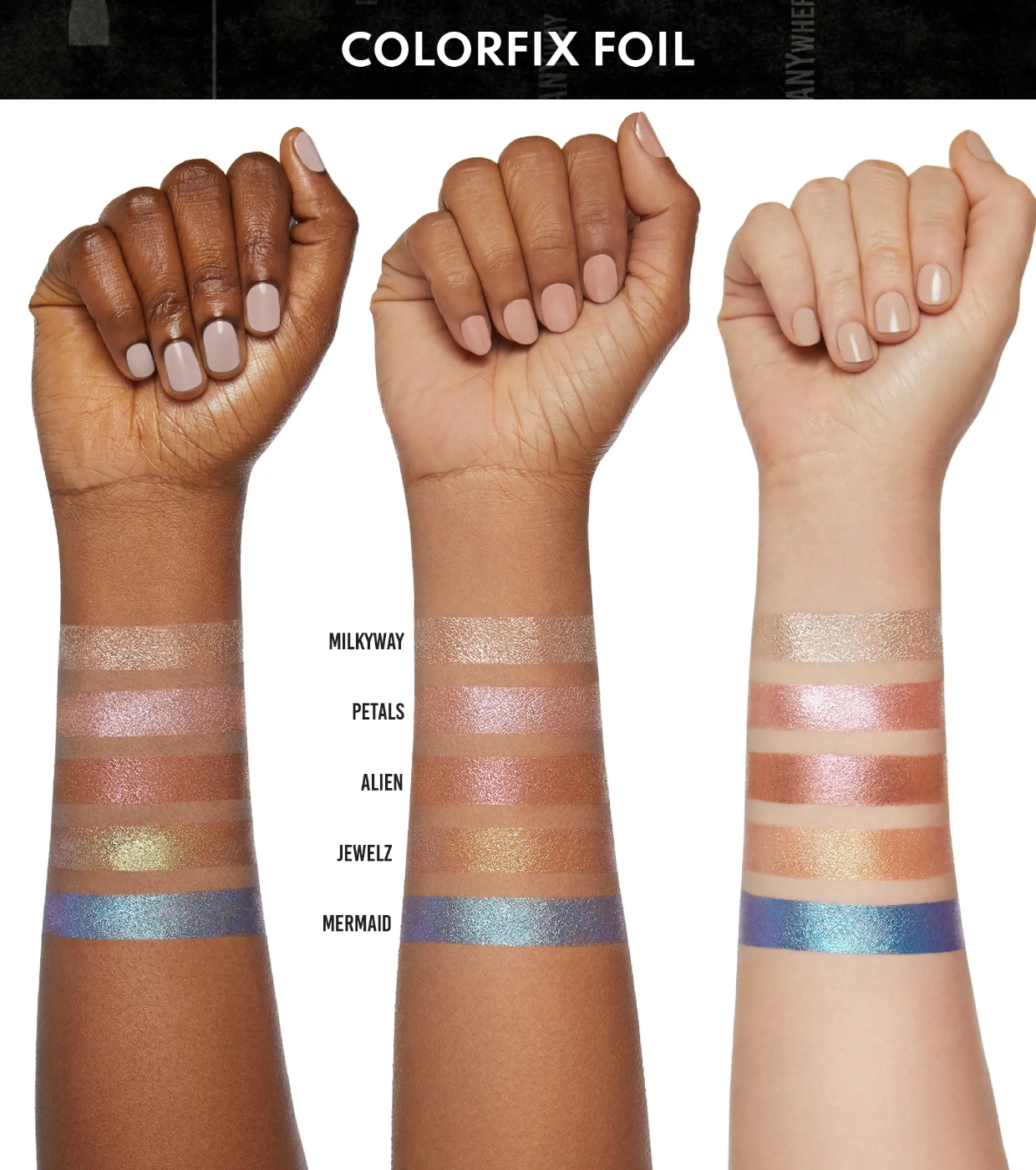 La gama Foils tiene una base de color en una textura muy fluida con partículas de microglitter que hacen que tenga un acabado deslumbrante.