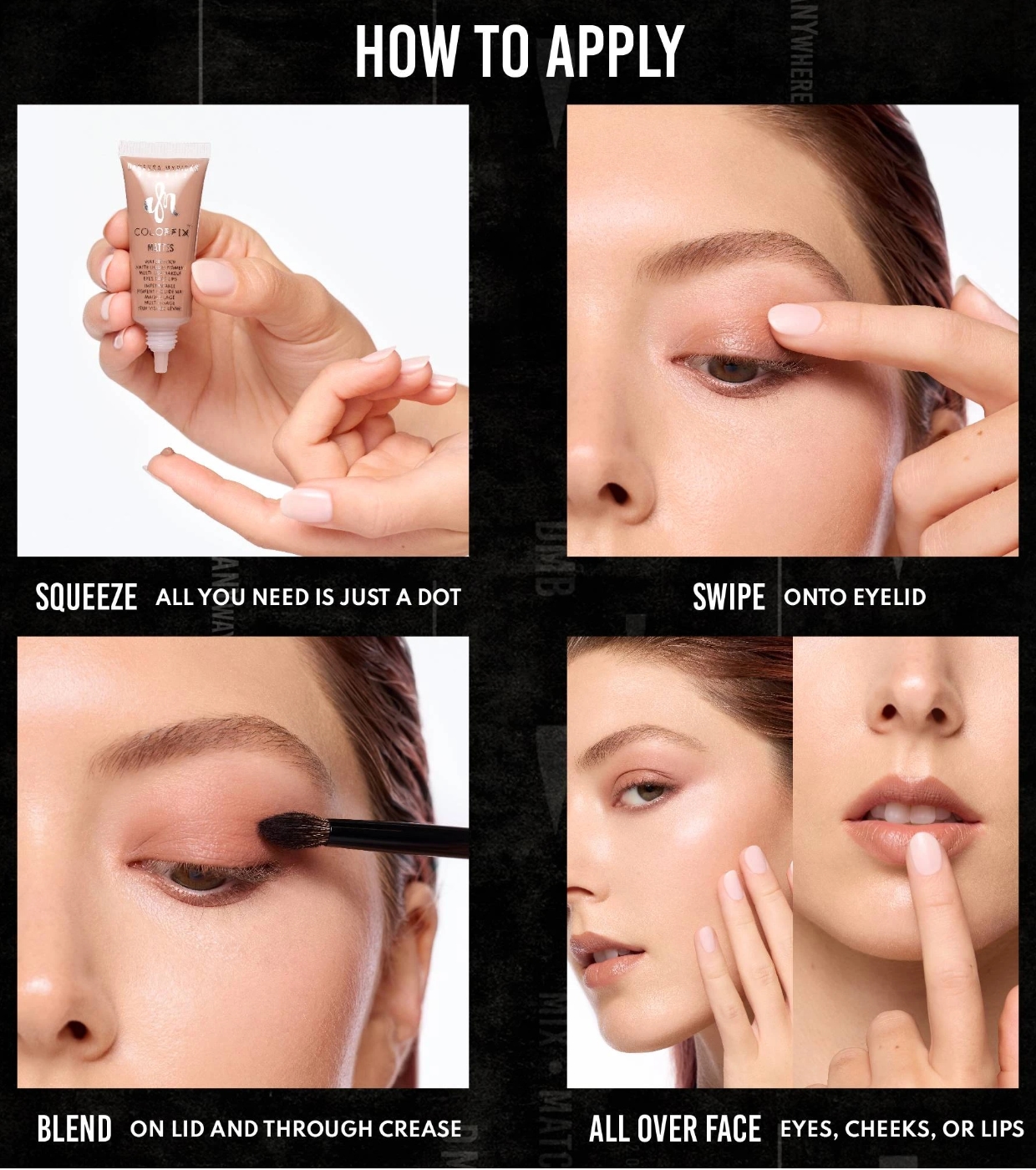 - Gloss: Úsalo solo para un acabado jugoso y satinado en ojos o labios, o en capas sobre otros acabados de Colorfix para un color y textura resistentes a pliegues.
