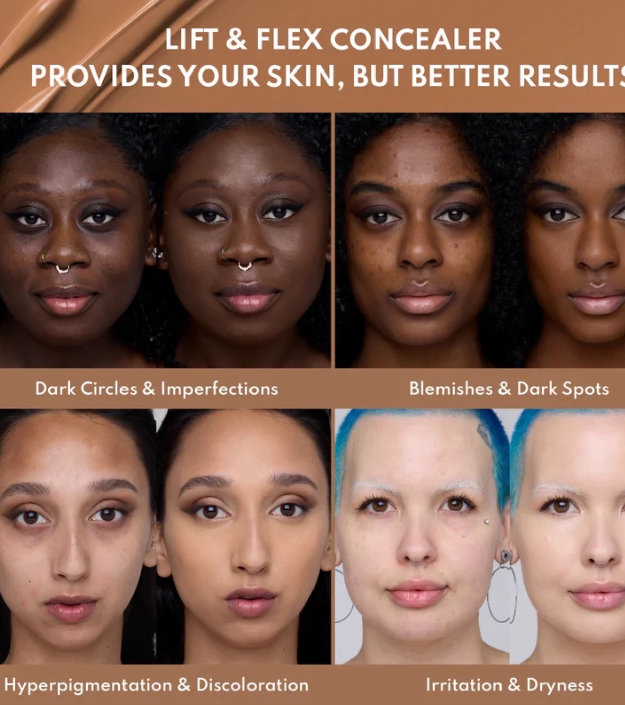 La gama de tonos de Lift and Flex Concealer es flexible y se adapta a cualquier tono de piel, abordando diversas necesidades de corrección.