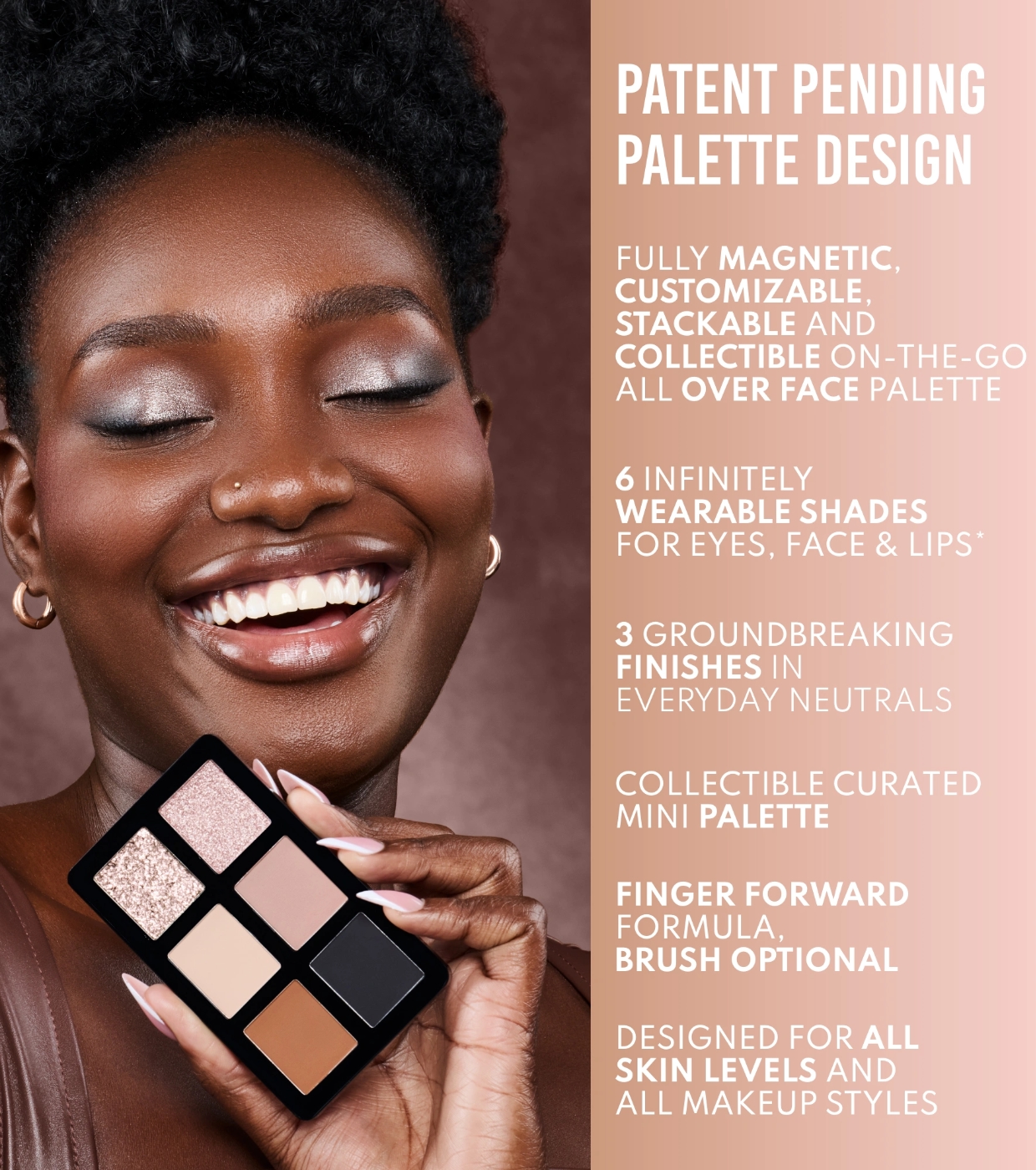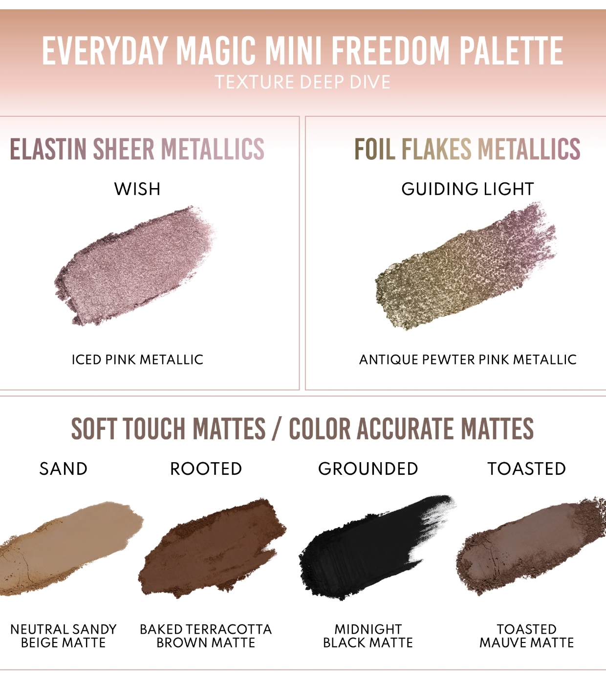 Esta paleta reúne seis tonos esenciales con acabados mágicos: una capa superior perlada ultrarreflectante y dinámica, un metálico cromado de alto impacto y cuatro mates de base con pigmentación precisa y fácil de trabajar.