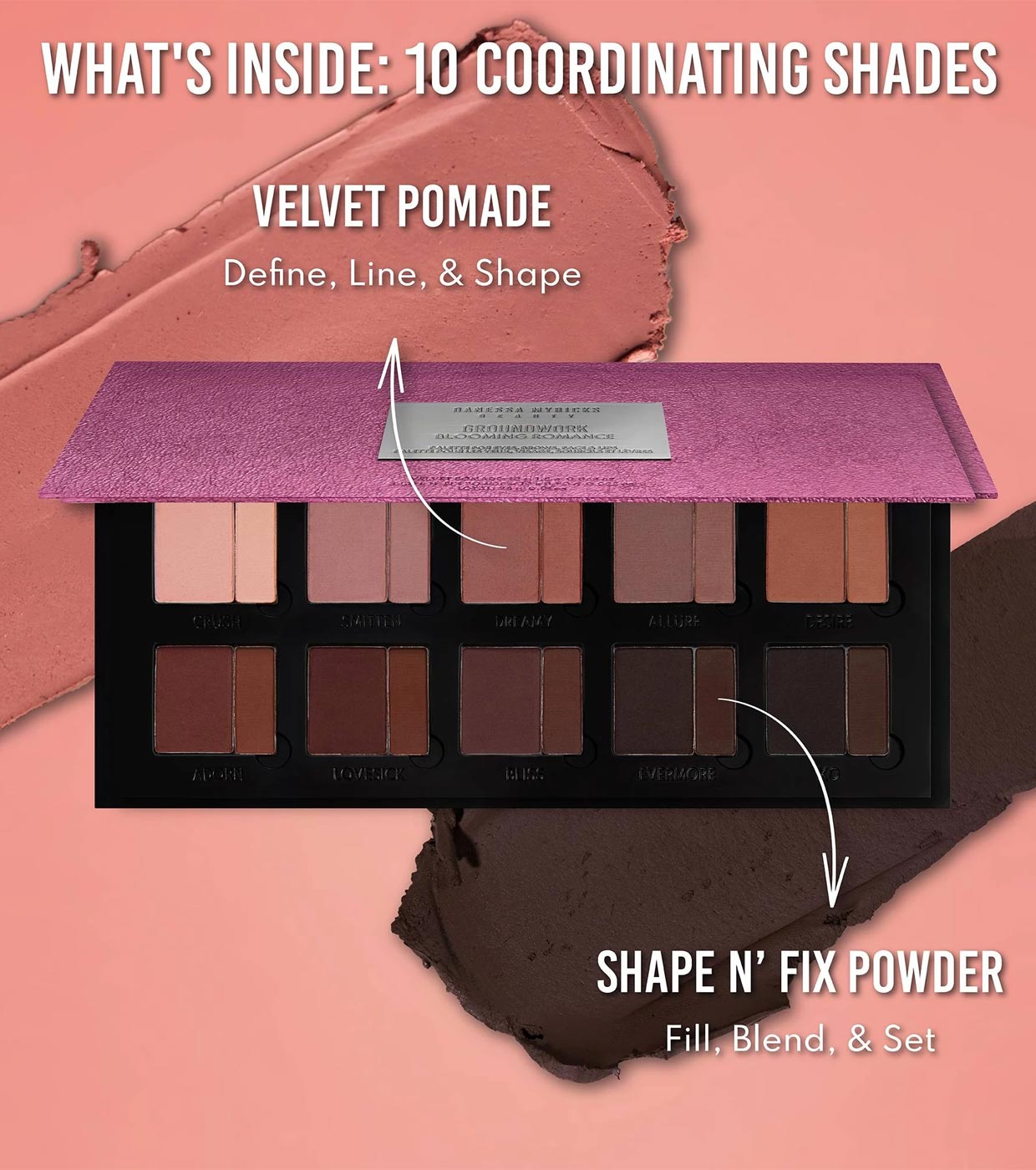 Groundwork Blooming Romance es una paleta multiusos para ojos, cejas, rostro y labios que combina textura en polvo y crema-polvo.