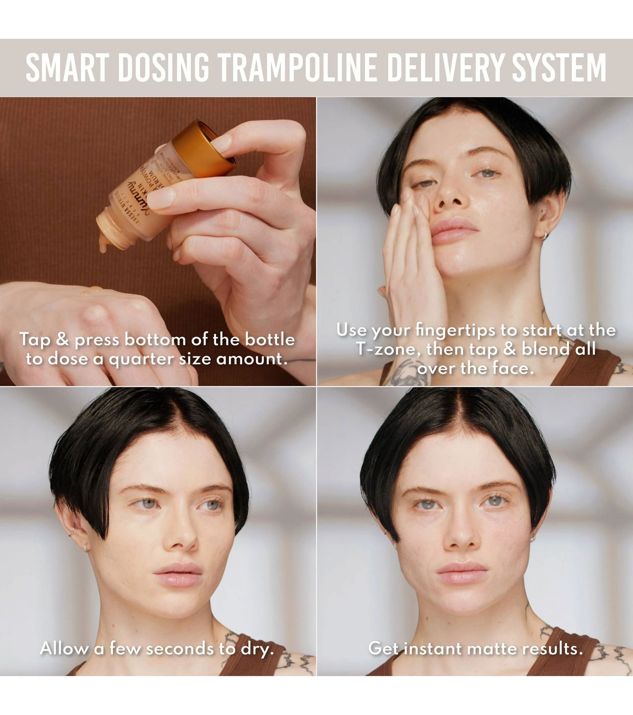 Su textura ligera se transforma de una sensación acuosa a un acabado mate empolvado, reduciendo instantáneamente los brillos y equilibrando la grasa durante todo el día.
