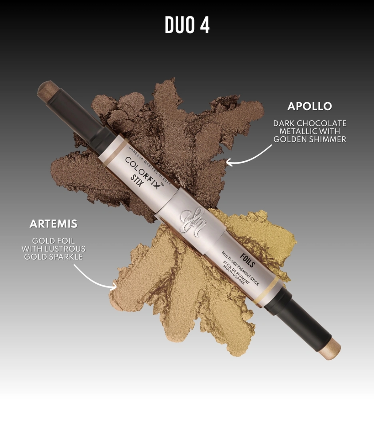 Descubre el Colorfix Stick Duo de Danessa Myricks con textura perlada y efecto refrescante al contacto, perfecta para aplicar en ojos, mejillas y labios.