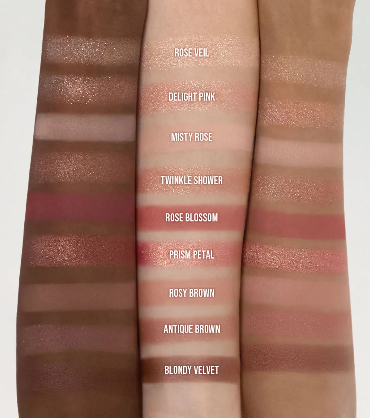 1 Rose Veil- Dimethicone, Synthetic Fluorphlogopite, Calcium Titanium Borosilicate, Calcium Aluminum Borosilicate, Methyl Methacrylate Crosspolymer, Titanium Dioxide (CI 77891), Neopentyl Glycol Diethylhexanoate, Hexyl Laurate, Dimethicone/Vinyl Dimethicone Crosspolymer, Mica, Nylon-12, Diglyceryl Sebacate/Isopalmitate, Sorbitan Sesquiisostearate, Silica, Magnesium Myristate, Dipentaerythrityl Hexahydroxystearate/Hexastearate/Hexarosinate, Phenoxyethanol, Propanediol, Synthetic Wax, Kaolin, Tocopherol, Iron Oxides (CI 77491), Tin Oxide, Carmine (CI 75470), Manganese Violet (CI 77742) 2 Delight Pink- Dimethicone, Calcium Titanium Borosilicate, Synthetic Fluorphlogopite, Methyl Methacrylate Crosspolymer, Titanium Dioxide (CI 77891), Neopentyl Glycol Diethylhexanoate, Mica, Hexyl Laurate, Dimethicone/Vinyl Dimethicone Crosspolymer, Nylon-12, Diglyceryl Sebacate/Isopalmitate, Sorbitan Sesquiisostearate, Magnesium Myristate, Dipentaerythrityl Hexahydroxystearate/Hexastearate/Hexarosinate, Propanediol, Phenoxyethanol, Synthetic Wax, Maltodextrin, Kaolin, Tocopherol, Iron Oxides (CI 77491), Carmine (CI 75470), Tin Oxide, Manganese Violet (CI 77742), Yellow 5 Lake (CI 19140) 3 Misty Rose- Talc, Mica, Titanium Dioxide (CI 77891), Nylon-12, Silica, Neopentyl Glycol Diethylhexanoate, Phenyl Trimethicone, Dimethicone, Magnesium Myristate, Magnesium Stearate, Methylpropanediol, Macadamia Ternifolia Seed Oil, Diisostearyl Malate, Dipentaerythrityl Hexahydroxystearate/Hexastearate/Hexarosinate, Isostearyl Neopentanoate, Octyldodecyl Stearoyl Stearate, Propanediol, Polybutene, Lauroyl Lysine, Aluminum Hydroxide, Hydrogenated Lecithin, Methicone, Triethoxycaprylylsilane, Iron Oxides (CI 77491), Ultramarines (CI 77007), Iron Oxides (CI 77499), Iron Oxides (CI 77492) 4 Twinkle Shower- Talc, Calcium Aluminum Borosilicate, Calcium Titanium Borosilicate, Calcium Sodium Borosilicate, Titanium Dioxide (CI 77891), Mica, Neopentyl Glycol Diethylhexanoate, Nylon-12, Phenyl Trimethicone, Dipentaerythrityl Hexahydroxystearate/Hexastearate/Hexarosinate, Magnesium Myristate, Silica, Iron Oxides (CI 77491), Octyldodecyl Stearoyl Stearate, Isostearyl Neopentanoate, Diisostearyl Malate, Magnesium Stearate, Methyl Methacrylate Crosspolymer, Methylpropanediol, Polybutene, Propanediol, Dimethicone, Lauroyl Lysine, Triethoxycaprylylsilane, Maltodextrin, Tin Oxide, Iron Oxides (CI 77499), Carmine (CI 75470), Iron Oxides (CI 77492) 5 Rose Blossom- Talc, Mica, Silica, Nylon-12, Carmine (CI 75470), Titanium Dioxide (CI 77891), Phenyl Trimethicone, Octyldodecyl Stearoyl Stearate, Iron Oxides (CI 77491), Boron Nitride, Magnesium Stearate, Dimethicone, Magnesium Myristate, Methylpropanediol, HDI/Trimethylol Hexyllactone Crosspolymer, Iron Oxides (CI 77499), Macadamia Ternifolia Seed Oil, Iron Oxides (CI 77492), Propanediol, Ultramarines (CI 77007), Maltodextrin, Lauroyl Lysine, Aluminum Hydroxide, Methicone, Triethoxycaprylylsilane 6 Prism Petal- Calcium Titanium Borosilicate, Calcium Aluminum Borosilicate, Talc, Triethylhexanoin, Calcium Sodium Borosilicate, Titanium Dioxide (CI 77891), Polyglyceryl-2 Triisostearate, Nylon-12, Mica, Carmine (CI 75470), Magnesium Myristate, Hydrogenated Castor Oil Isostearate, Magnesium Stearate, Methylpropanediol, Propanediol, Iron Oxides (CI 77491), Ultramarines (CI 77007), Tin Oxide, Maltodextrin, Yellow 5 Lake (CI 19140), Dimethicone, Lauroyl Lysine, Vinyl Dimethicone/Methicone Silsesquioxane Crosspolymer, Triethoxycaprylylsilane, Iron Oxides (CI 77499) 7 Rosy Brown- Talc, Mica, Silica, Octyldodecanol, Octyldodecyl Stearoyl Stearate, Phenyl Trimethicone, Carmine (CI 75470), Magnesium Myristate, Methylpropanediol, Nylon-12, Iron Oxides (CI 77491), HDI/Trimethylol Hexyllactone Crosspolymer, Dimethicone, Macadamia Ternifolia Seed Oil, Yellow 5 Lake (CI 19140), Dipentaerythrityl Hexahydroxystearate/Hexastearate/Hexarosinate, Dimethiconol Stearate, Magnesium Stearate, Propanediol, Iron Oxides (CI 77492), Diisostearyl Malate, Titanium Dioxide (CI 77891), Iron Oxides (CI 77499), Hydrogenated Lecithin, Triethoxycaprylylsilane, Maltodextrin, Ultramarines (CI 77007), Aluminum Hydroxide, Methicone 8 Antique Brown- Mica, Talc, Manganese Violet (CI 77742), Calcium Aluminum Borosilicate, Octyldodecanol, Silica, Diisostearyl Malate, Titanium Dioxide (CI 77891), Nylon-12, Iron Oxides (CI 77492), Iron Oxides (CI 77491), Dimethicone, Magnesium Myristate, Methylpropanediol, Carmine (CI 75470), Dipentaerythrityl Hexahydroxystearate/Hexastearate/Hexarosinate, Macadamia Ternifolia Seed Oil, Magnesium Stearate, Propanediol, Iron Oxides (CI 77499), Kaolin, Triethoxycaprylylsilane, Ultramarines (CI 77007), Tin Oxide, Maltodextrin, Aluminum Hydroxide, Methicone 9 Blondy Velvet- Mica, Talc, Iron Oxides (CI 77491), Triethylhexanoin, Titanium Dioxide (CI 77891), Synthetic Fluorphlogopite, Polyglyceryl-2 Triisostearate, Iron Oxides (CI 77499), Nylon-12, Iron Oxides (CI 77492), Hydrogenated Castor Oil Isostearate, Carmine (CI 75470), Silica, Methylpropanediol, Magnesium Myristate, Magnesium Stearate, Propanediol, Dimethicone, Triethoxycaprylylsilane, Ultramarines (CI 77007), Lauroyl Lysine, Maltodextrin, Tin Oxide, Ferric Ferrocyanide (CI 77510)