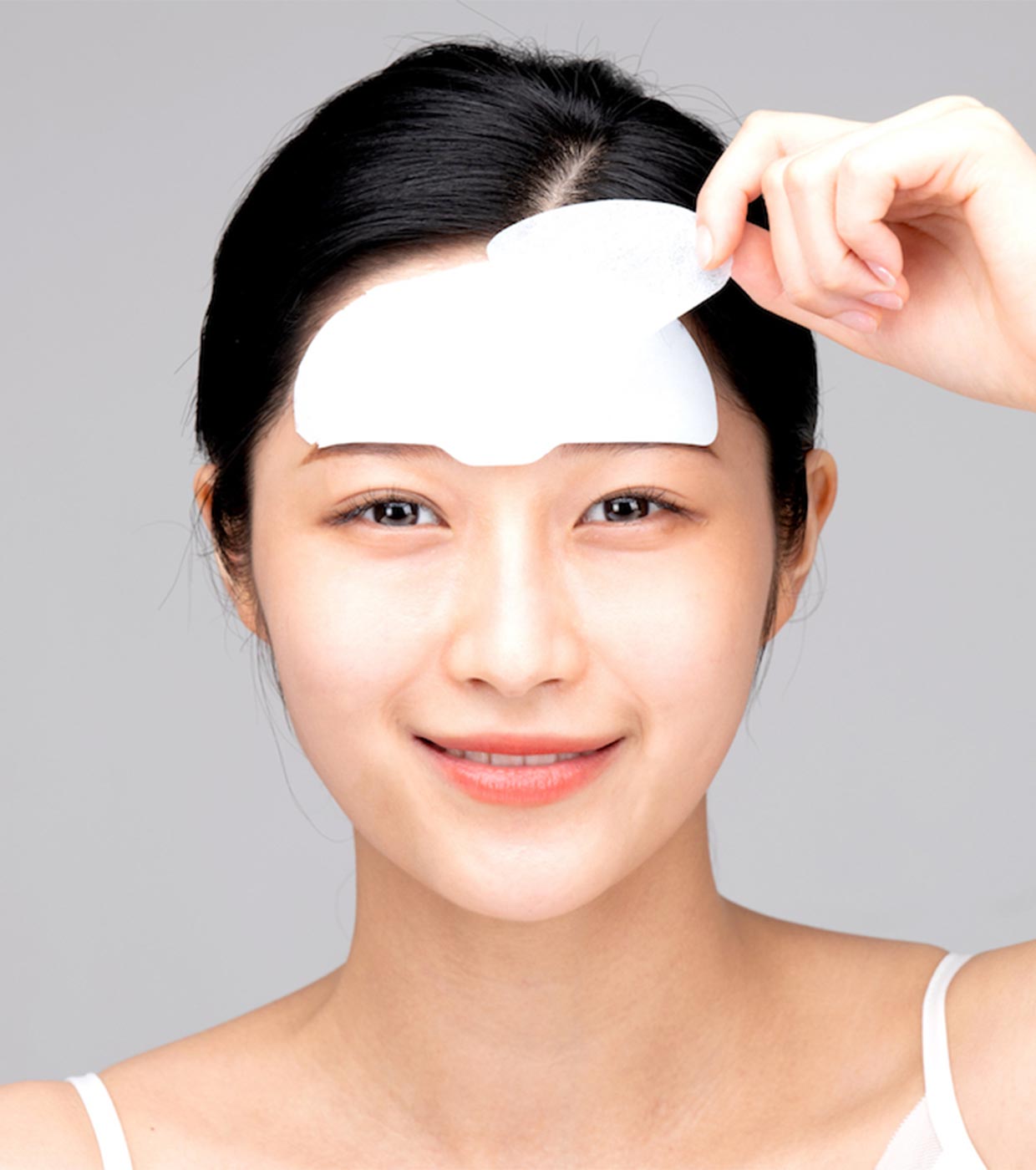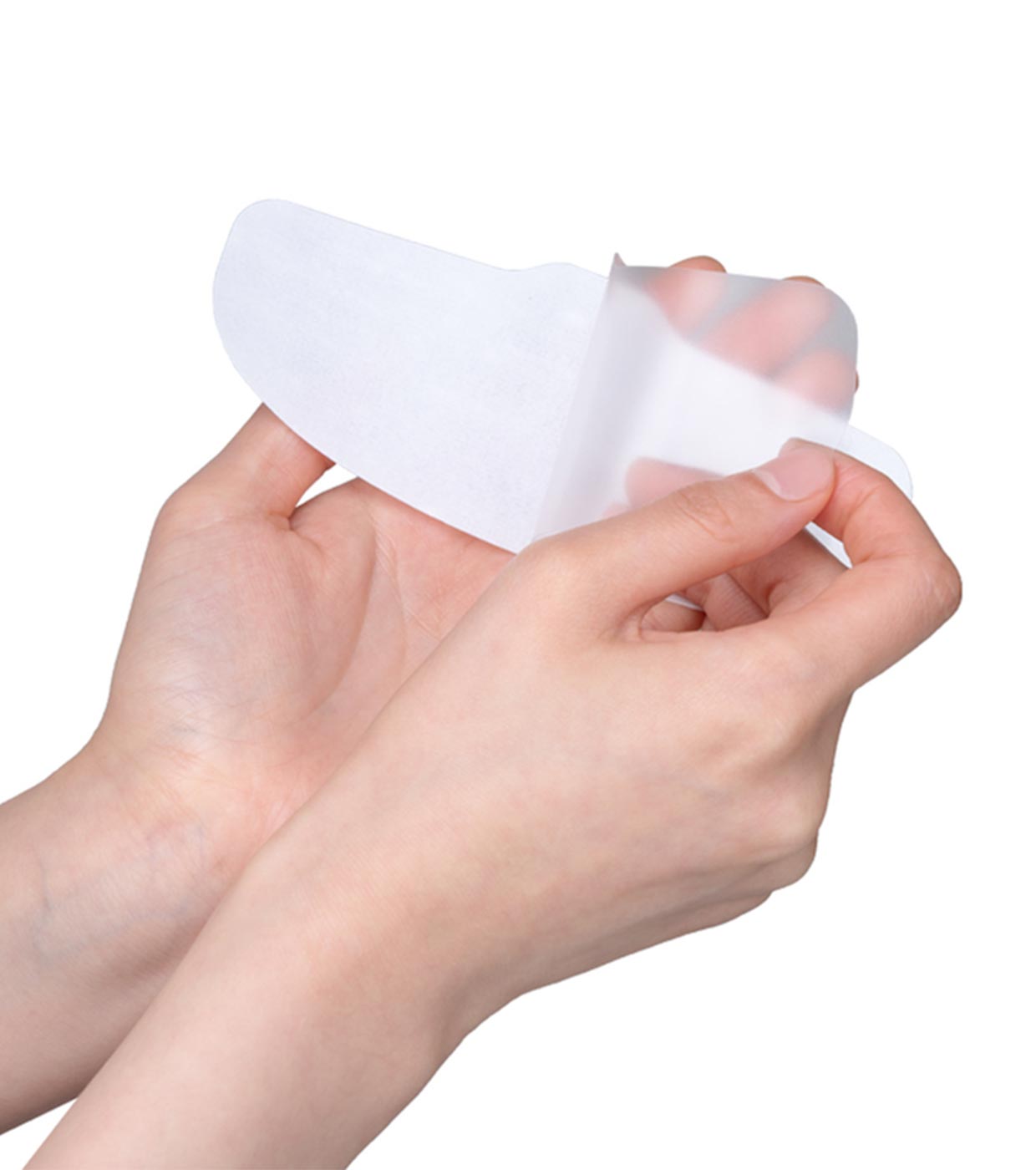 3.- Coloca el parche en el rostro con el lado blanco hacia abajo. Presiona para que se adhiera a la piel y se separe de la otra capa.