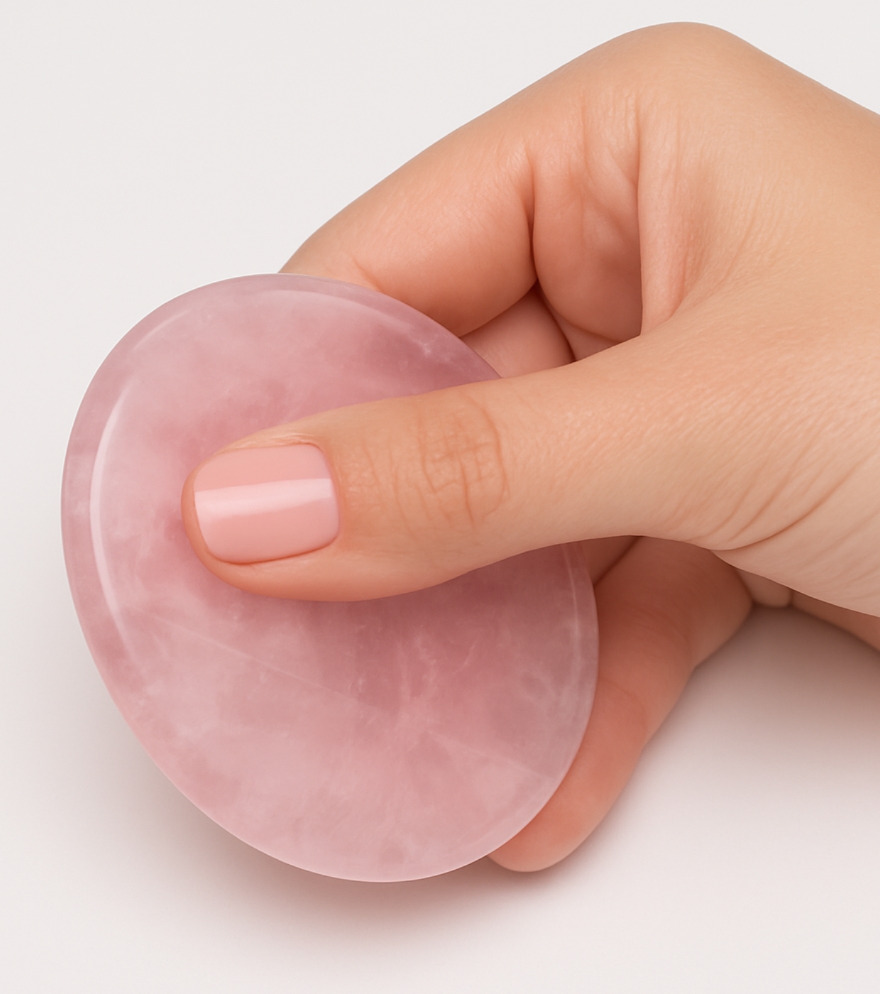 Tallada a mano, el cuarzo rosa Nintai de Diana Piriz, cuenta con un surco central especialmente diseñado para colocar el dedo.