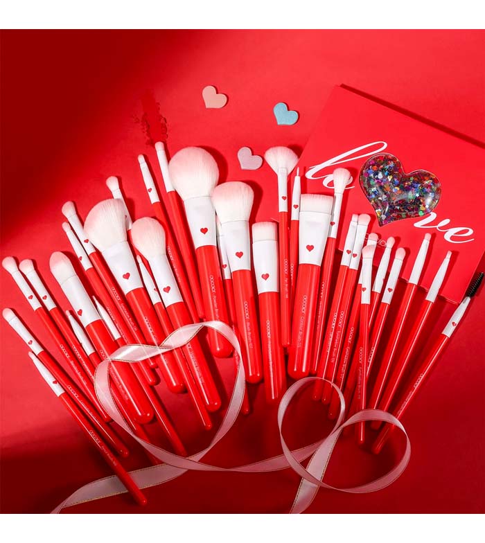 Las brochas de este set tienen un precioso diseño en rojo pasión y pelo sintético.