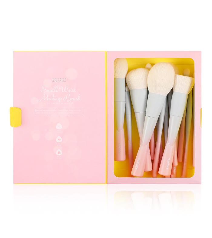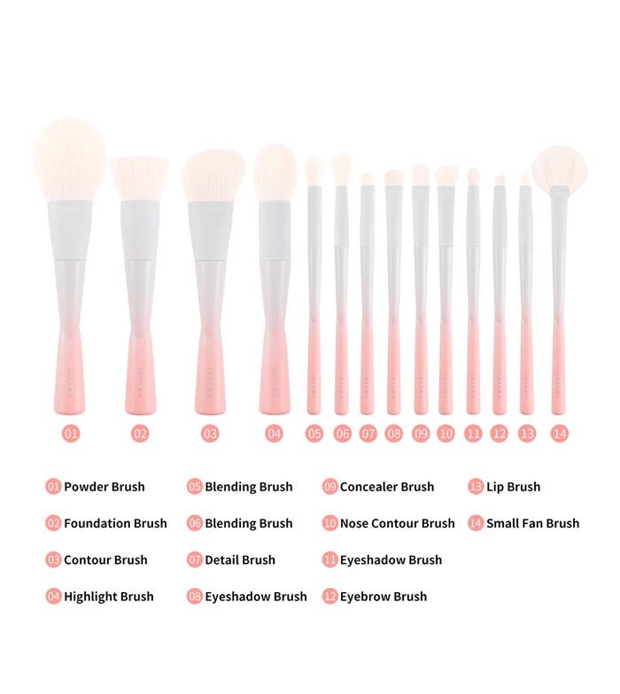 Contiene un total de 14 pinceles, cada uno de ellos con una forma cuidada para lograr su correcta su función.