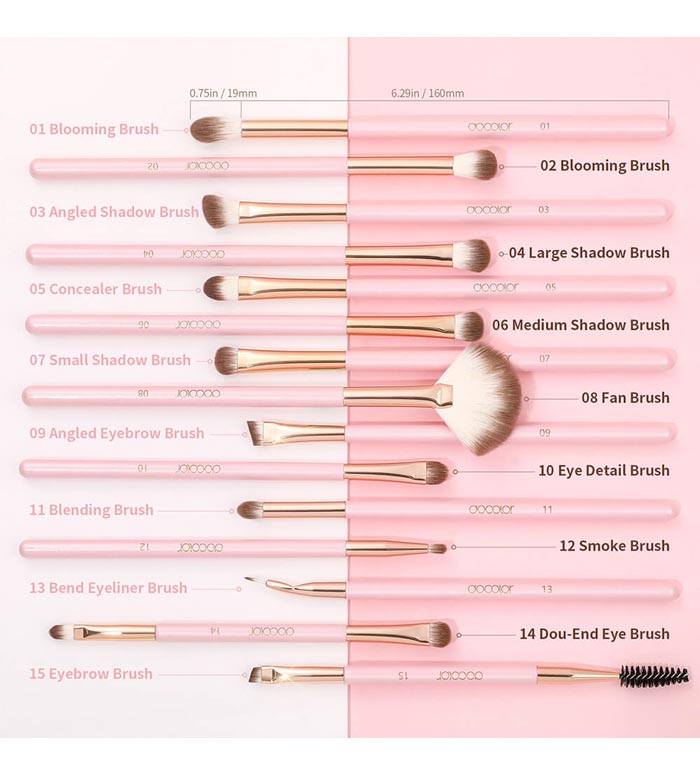 Contiene un total de 15 pinceles, cada uno de ellos con una forma cuidada para lograr su correcta su función.