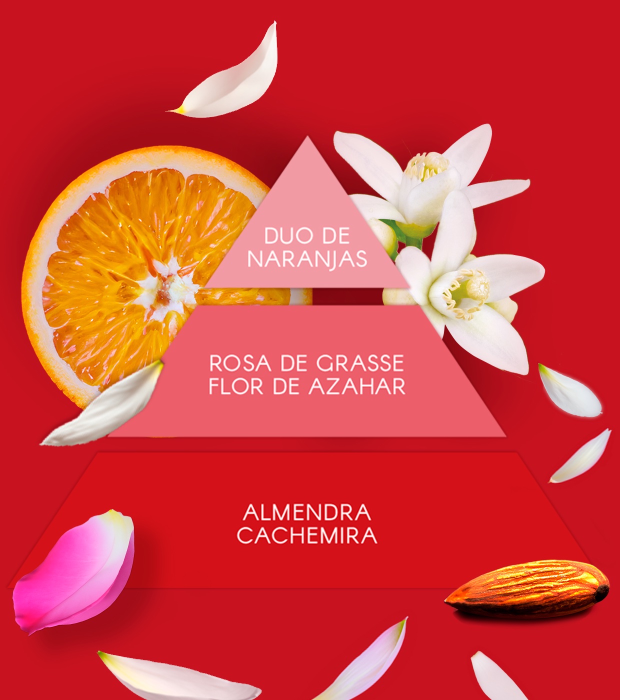 La fragancia, el alma de Red Party, ofrece un aroma fresco y enérgico, compuesto por un dúo de naranjas, y enriquecido con delicadas notas de rosa y flor de azahar. La base de almendra y cachemira aporta una calidez envolvente, creando un aroma refinado y sofisticado.