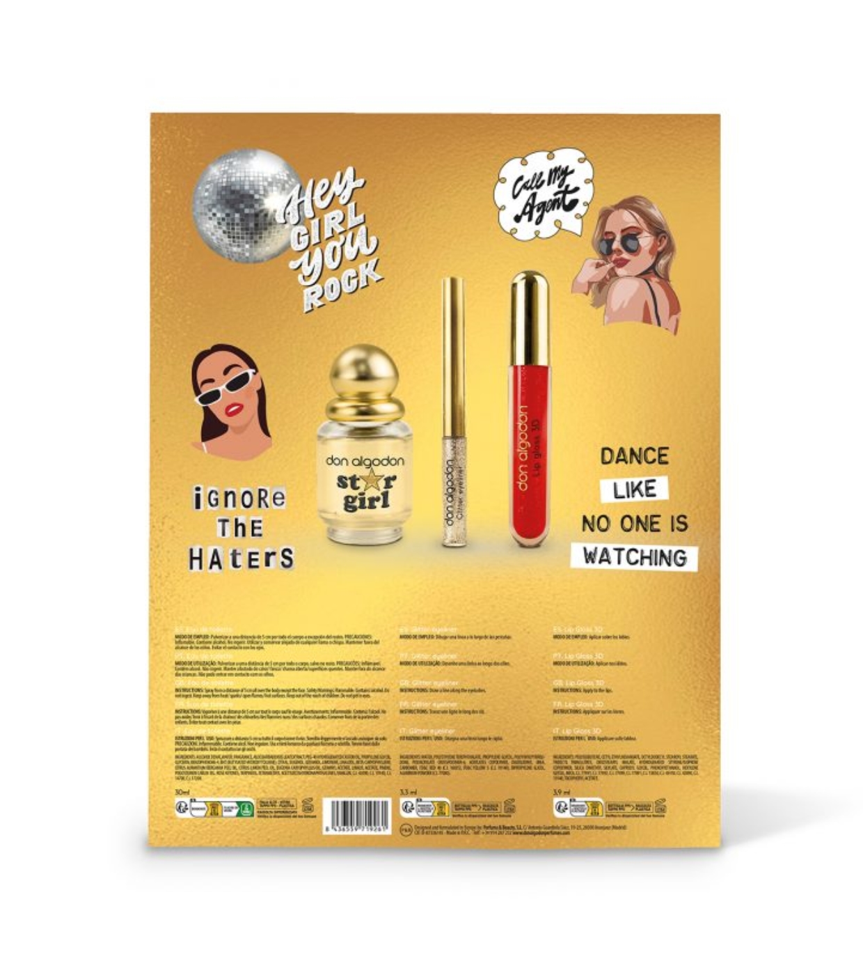 Este set incluye la fragancia Star Girl de 30 ml, un 3D Lipgloss rojo, un eyeliner con glitter y un neceser metalizado.