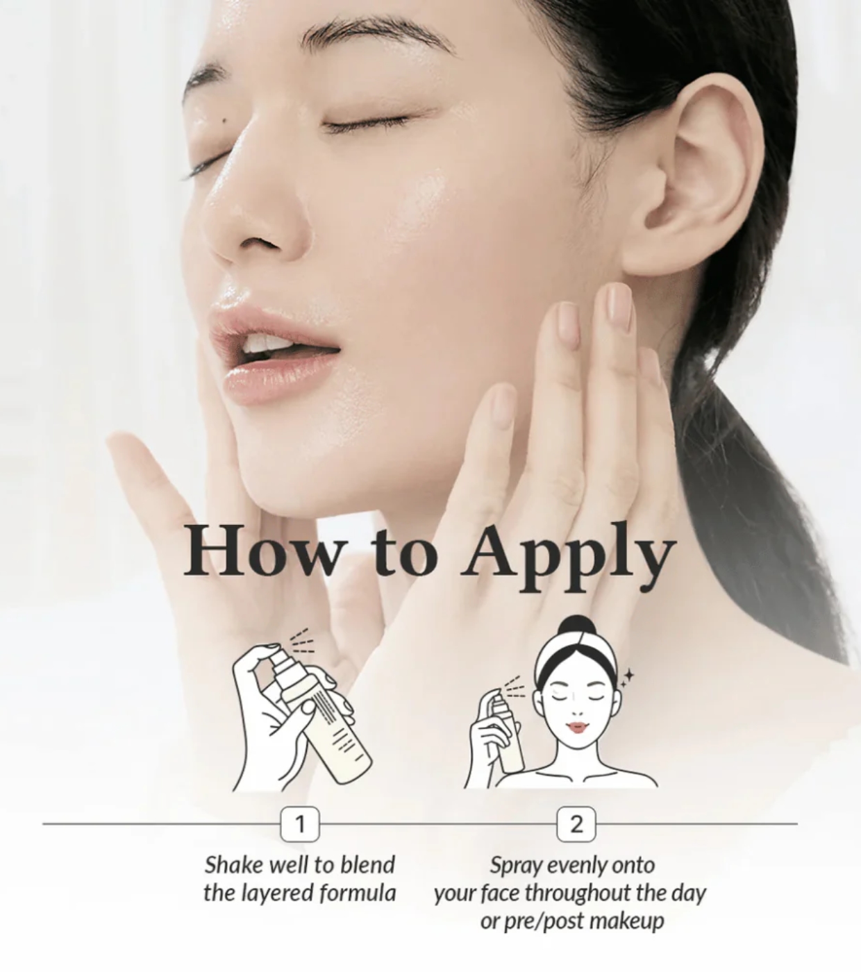 Solo tienes que agitar para mezclar ambas capas y pulverizar la bruma ligera sobre el rostro para disfrutar de una sensación refrescante, confortable y luminosa al instante.