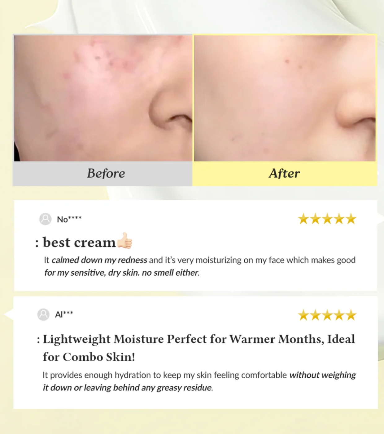 Ideal para pieles sensibles, reactivas o afectadas por brotes, esta crema ayuda a reducir rojeces, calmar irritaciones y prevenir el envejecimiento prematuro, favoreciendo una piel más uniforme, suave y saludable.