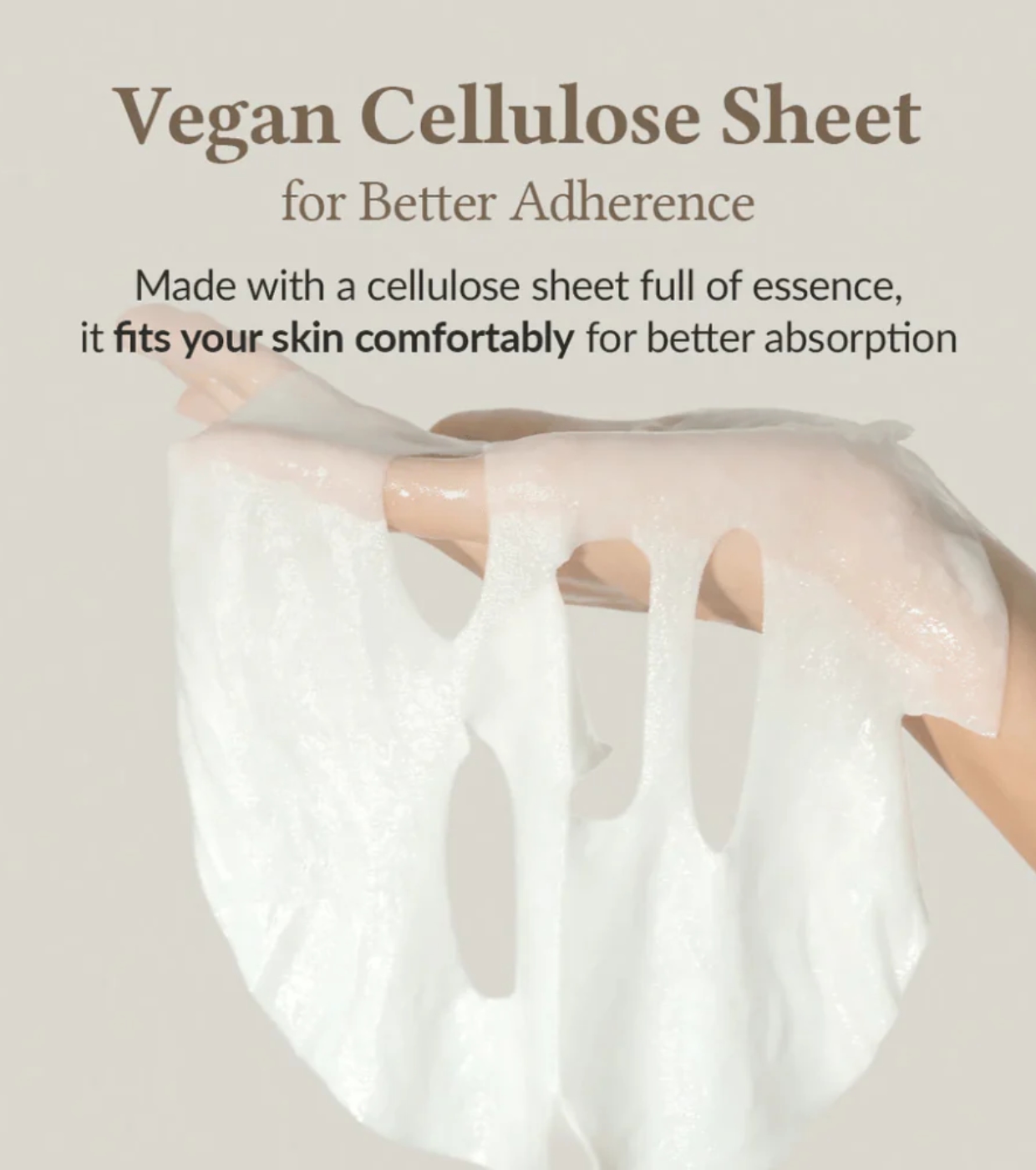 La mascarilla está elaborada con un tejido de celulosa vegana de alta adherencia que se ajusta perfectamente al rostro, facilitando la absorción de los activos y potenciando sus resultados en solo 10–15 minutos.