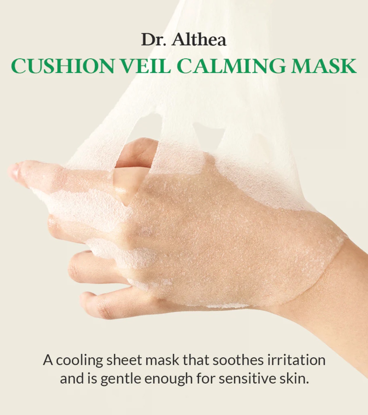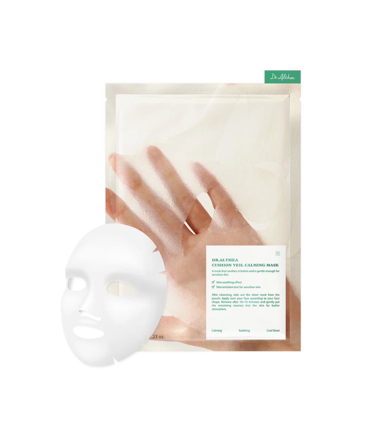 Mascarilla calmante Cushion Veil de Dr. Althea formulada con Cica Complex, que incluye Asiaticósido y Madecassósido, ingredientes conocidos por sus propiedades calmantes que ayudan a aliviar la piel irritada.