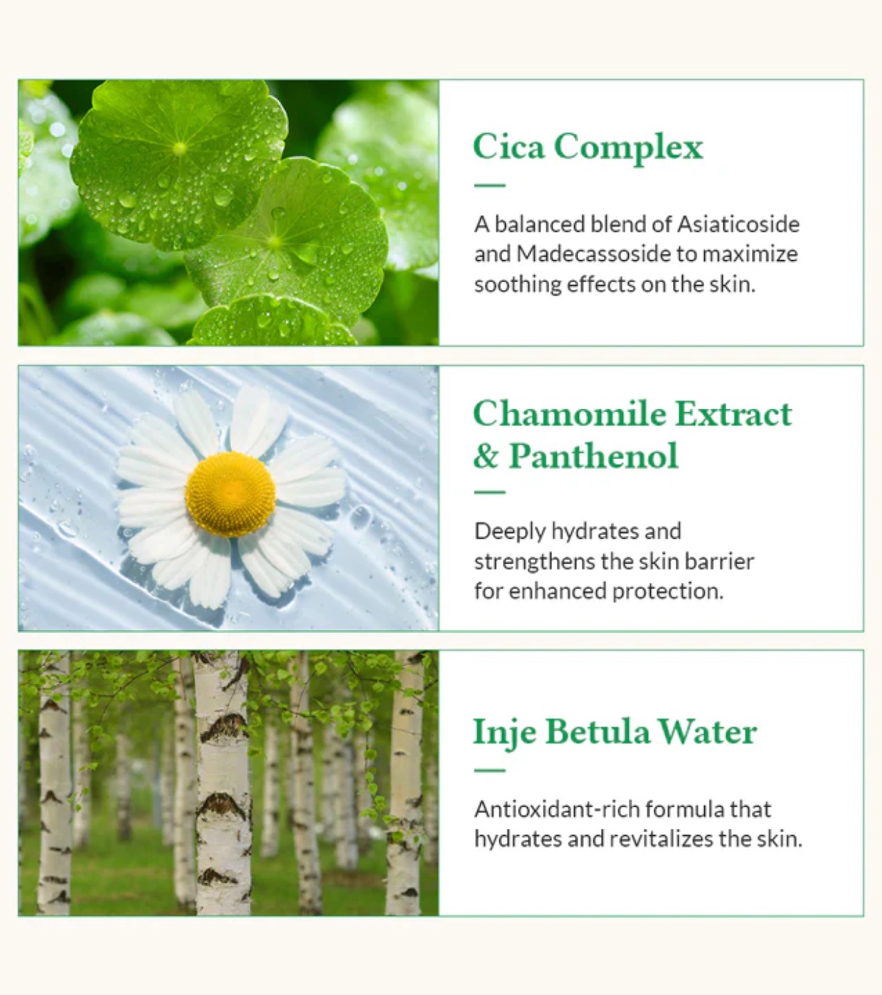 Water, Butylene Glycol, 1,2-Hexanediol, Diglycerin, Panthenol, Polyglycerin-3, Betula Platyphylla Japonica Juice, Arginine, Carbomer, Allantoin, Polyglyceryl-10 Laurate, Ethylhexylglycerin, Xanthan Gum, Disodium Edta, Glyceryl Caprylate, Centella Asiatica Extract, Anthemis Nobilis Flower Extract, Asiaticoside, Madecassoside, Asiatic Acid, Madecassic Acid